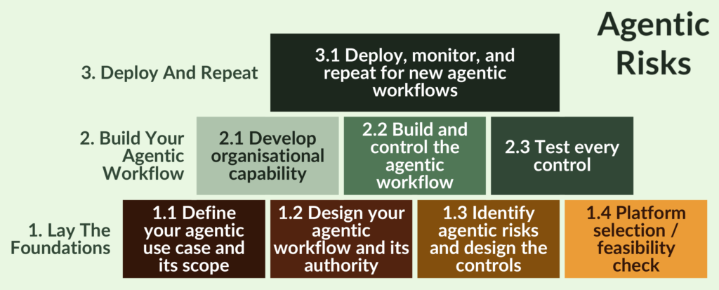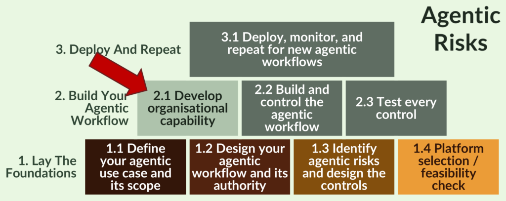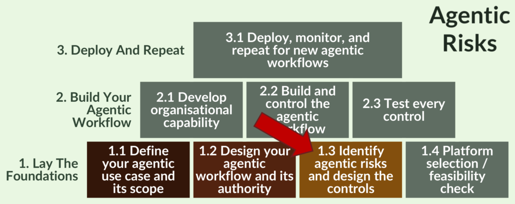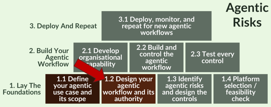 - Step 1.2 defines the limits of agentic authority and Step 1.3 identifies the risks: Step 2.2 enforces them.