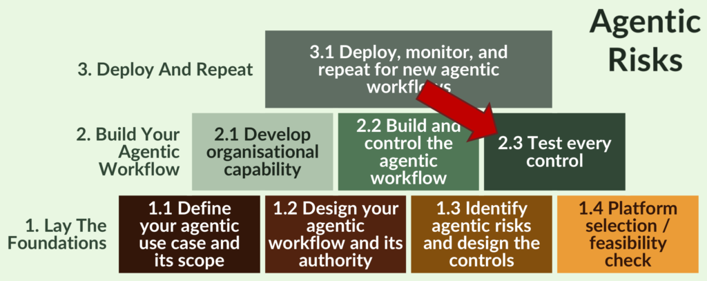 This step exists to prove that the risks identified in Step 1.3 are controllable in practice through systematic testing and control of AI agents. Your focus should be on testing all the expected functionalities and risk controls under realistic conditions, including adversarial tests like ‘red teaming’.