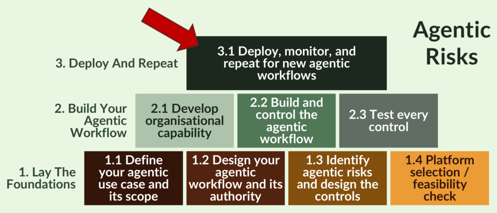 Executive summary: this phase turns a one-off agent into a governed, repeatable, and actively monitored organisational capability, where monitoring is treated as a control, not an afterthought.