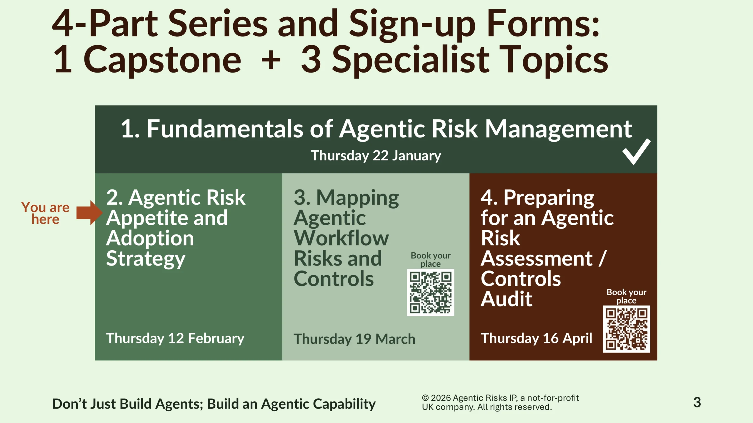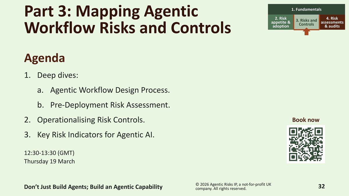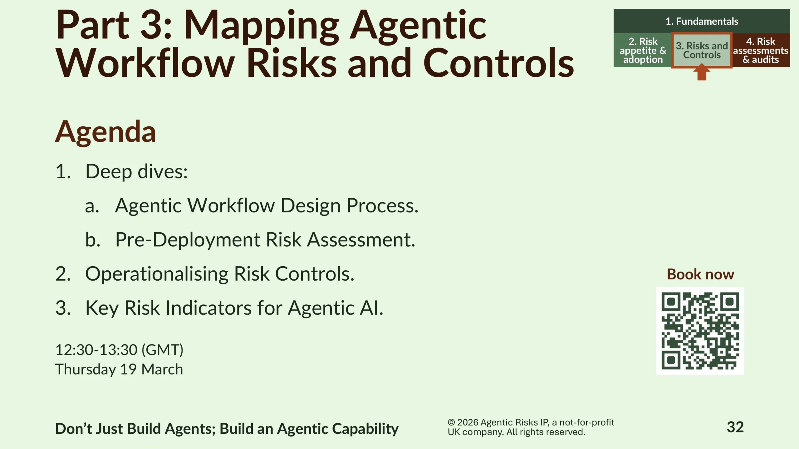 Register now for Part 3, which will cover ‘Mapping Agentic Workflow Risks and Controls’. In this session, we will deep dive into the agentic workflow design process, a pre-deployment agentic risk assessment, the operationalisation of risk controls, and key risk indicators for agentic AI. Join us at 12:30-13:30 (GMT) on Thursday 19 March.