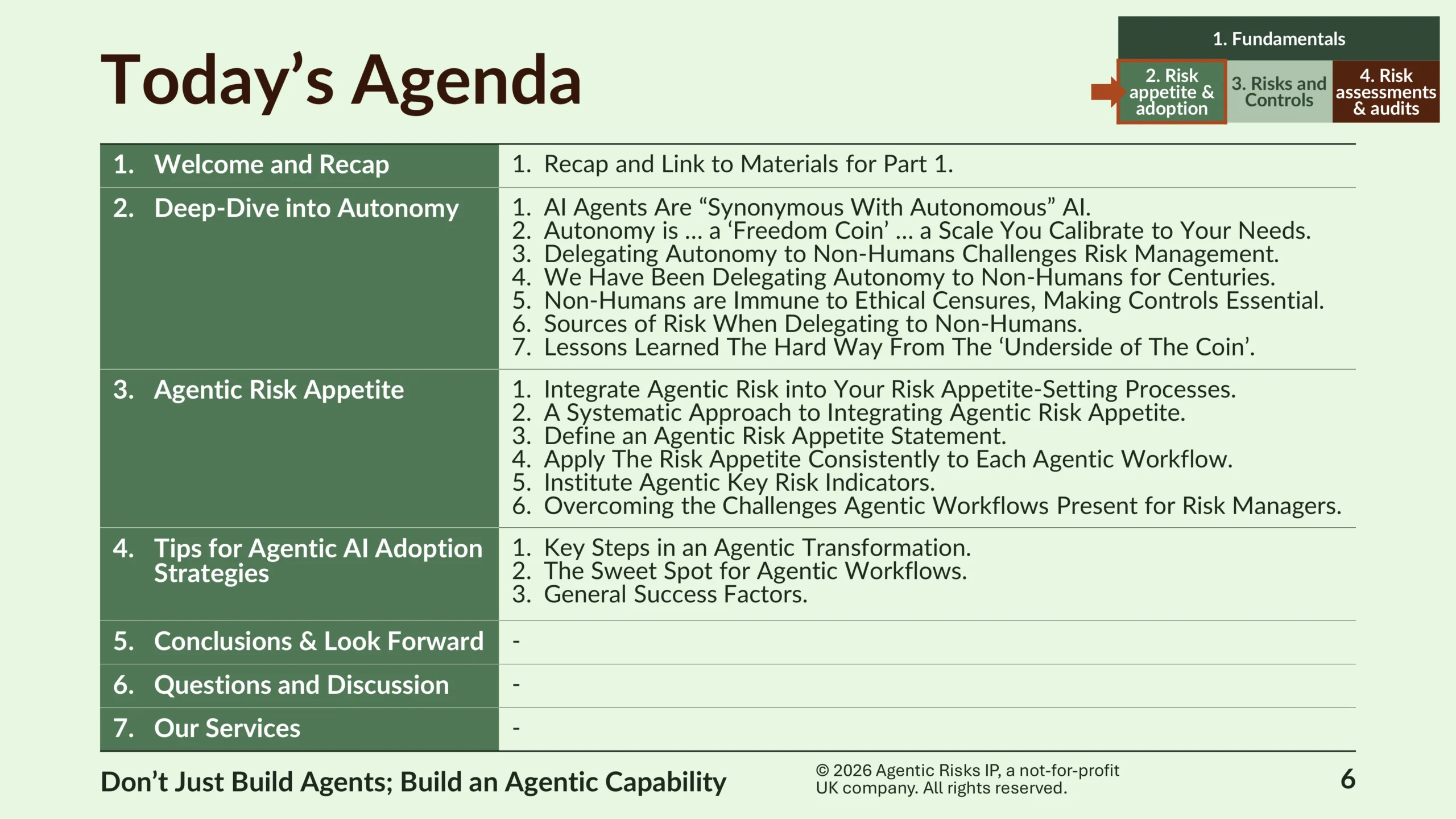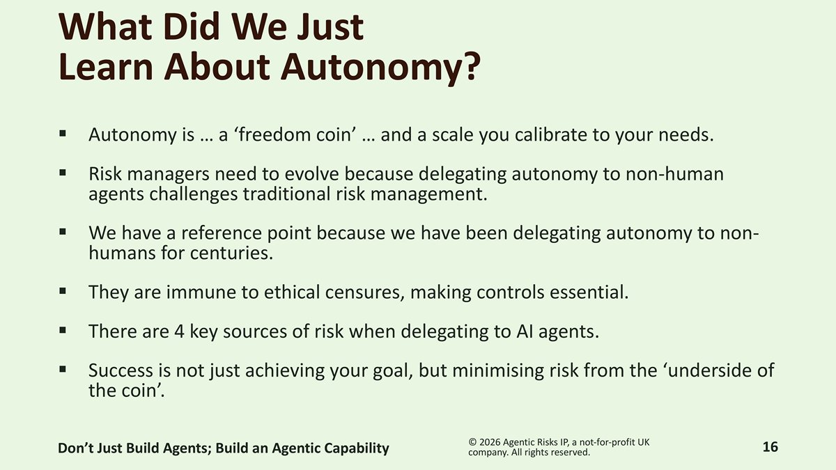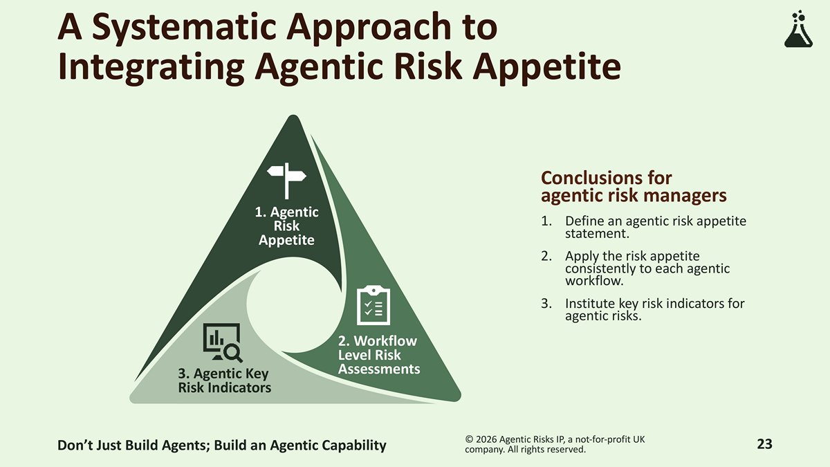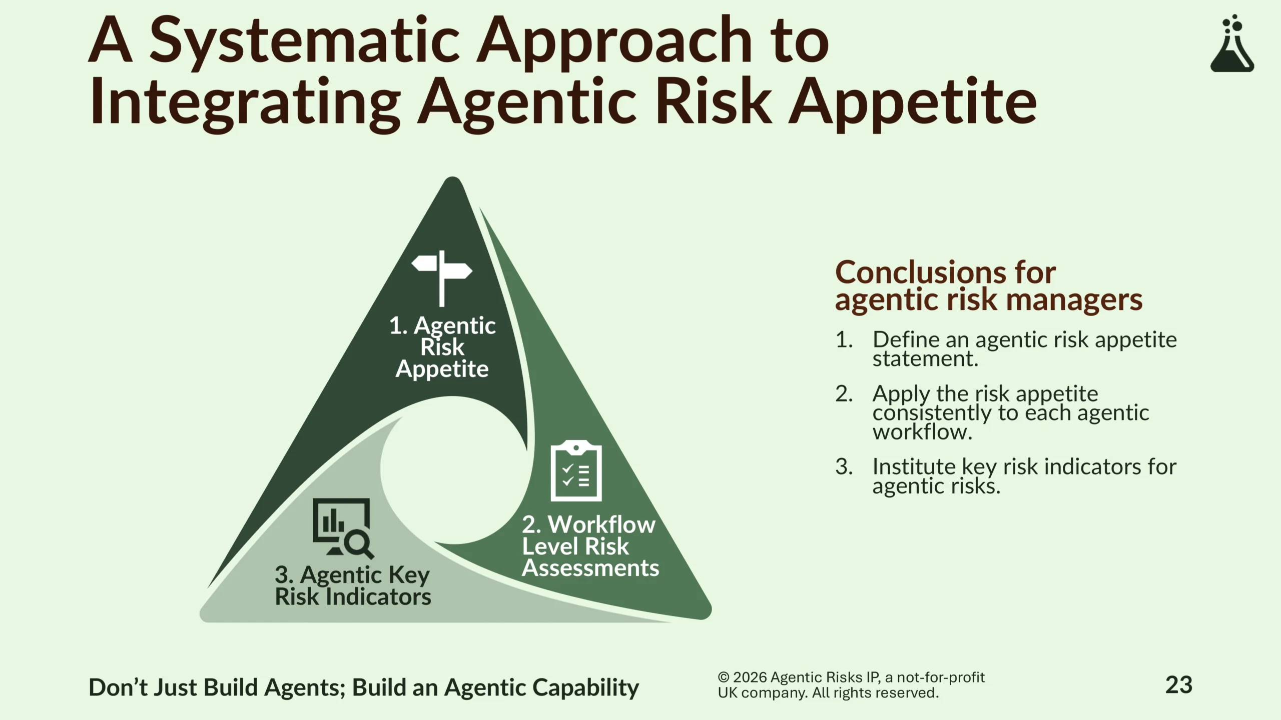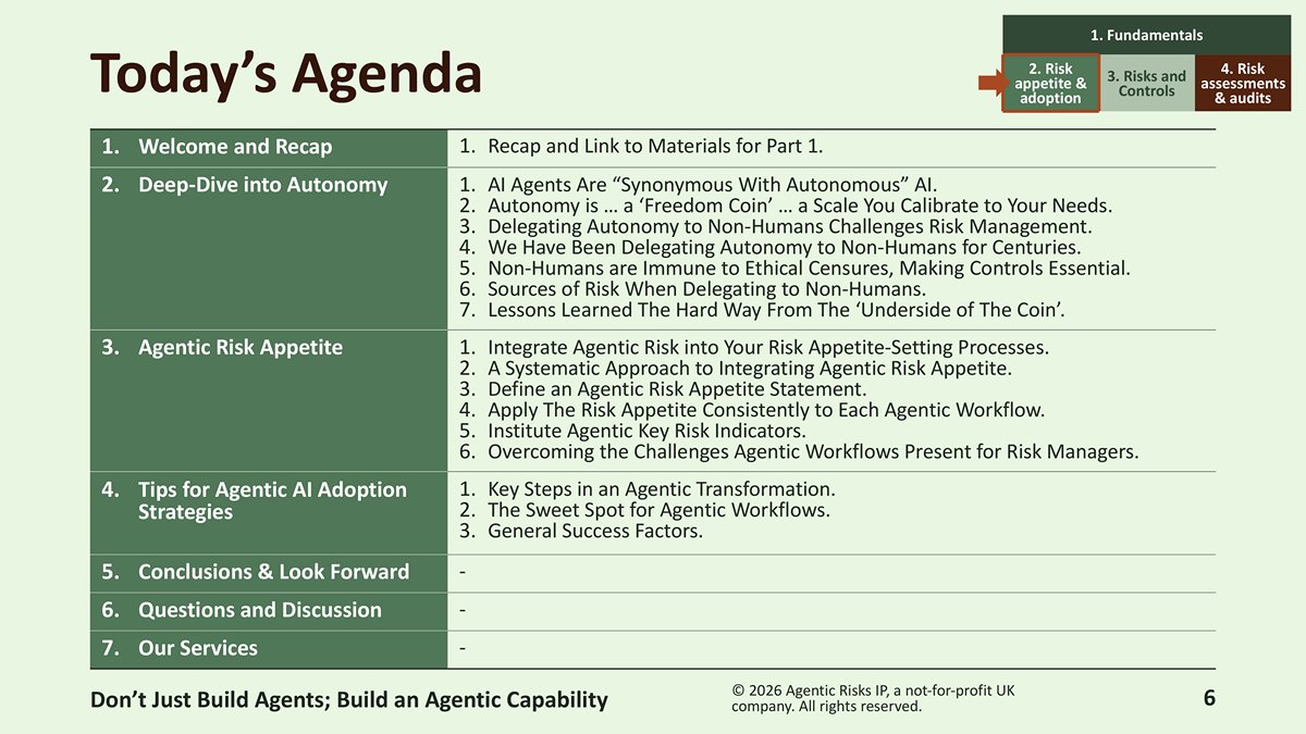 Here is a summary of my presentation on agentic risk appetite (including attendees’ Q&A at the end), the full video, and a download link to the slides, which include all the concepts and links to deep-dive content.
