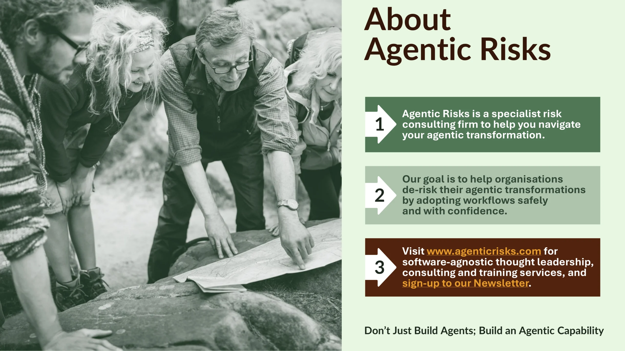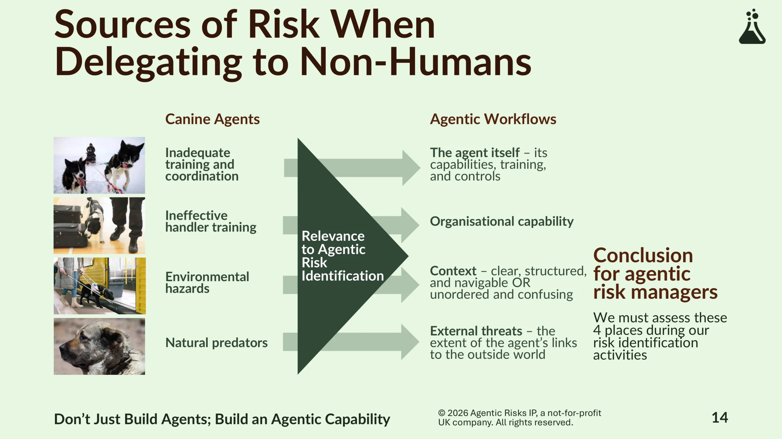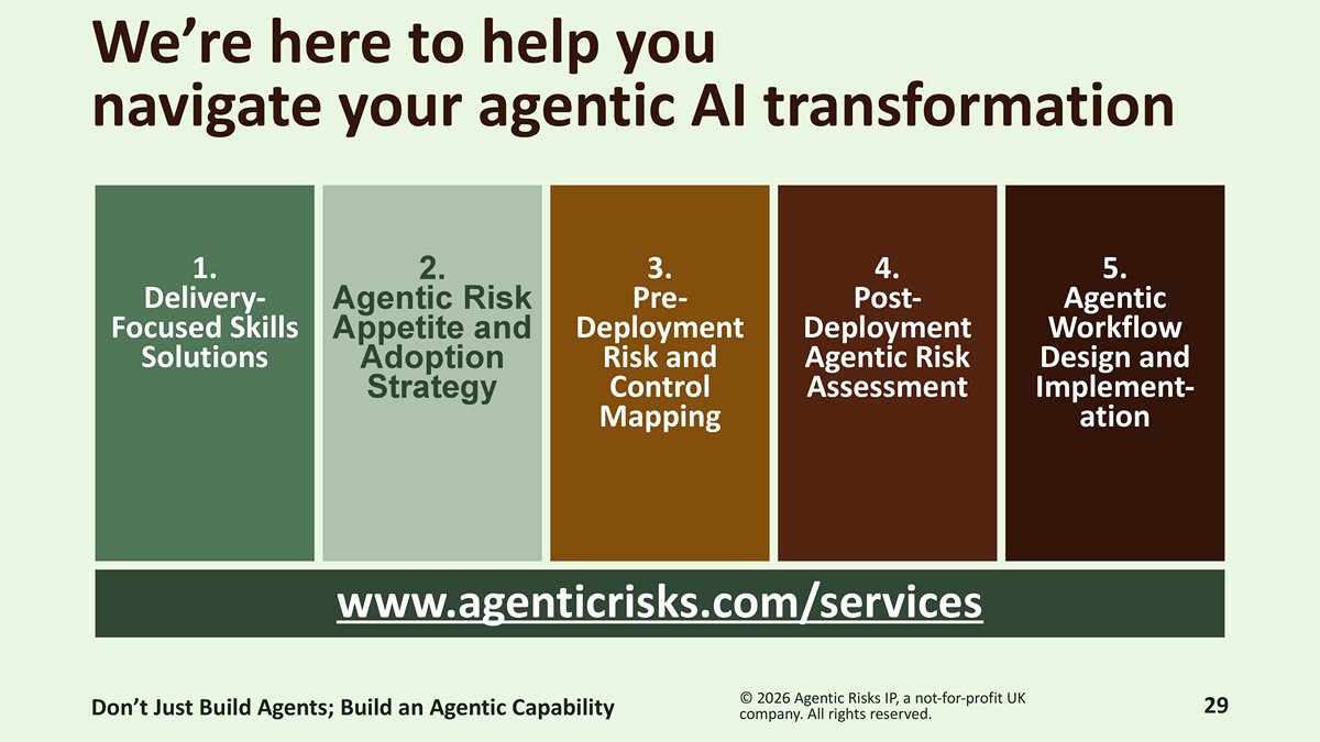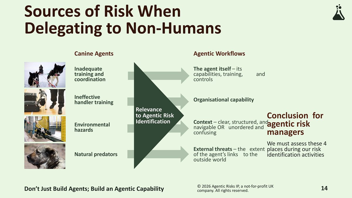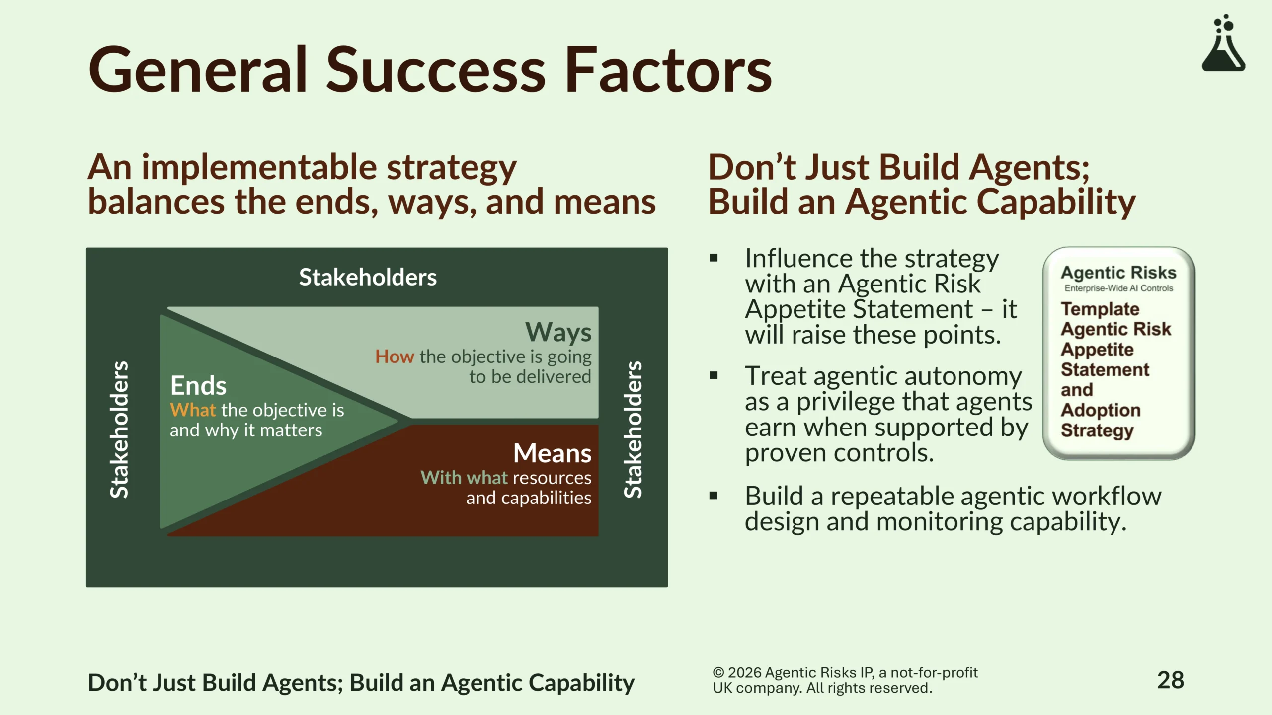 - While you are still developing your agentic capability, identifying the risks will be novel, so be systematic in covering the four sources of risk (the agent itself, organisational capability, context, and external threats) and use objective agentic risk taxonomies like the Enterprise-Wide Agentic AI Risk Control Framework and the MIT Risk Repository to make sure you cover everything.