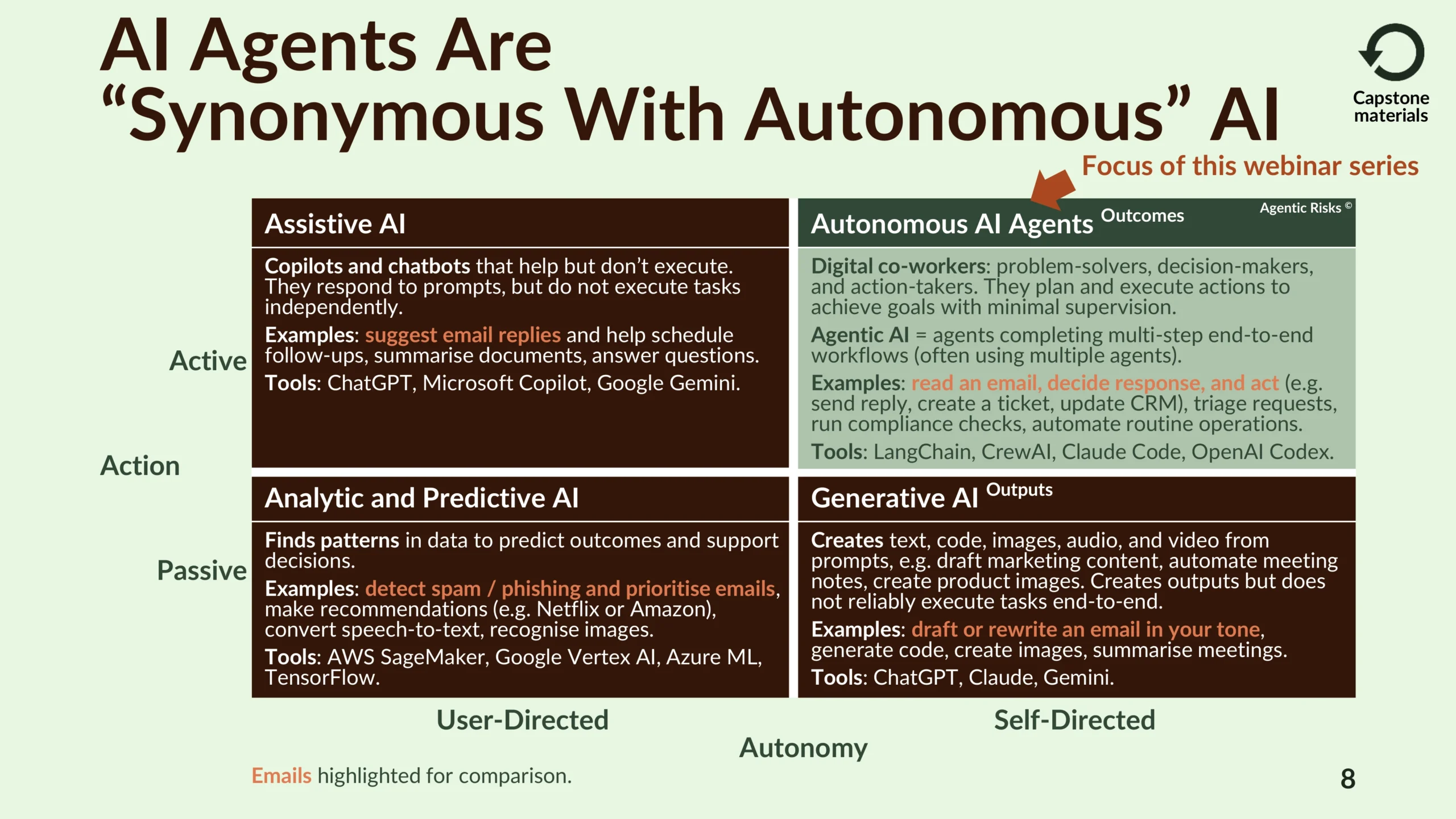 - Organisational capability (your ability to identify ownership, constrain behaviour, and stop the agent safely).