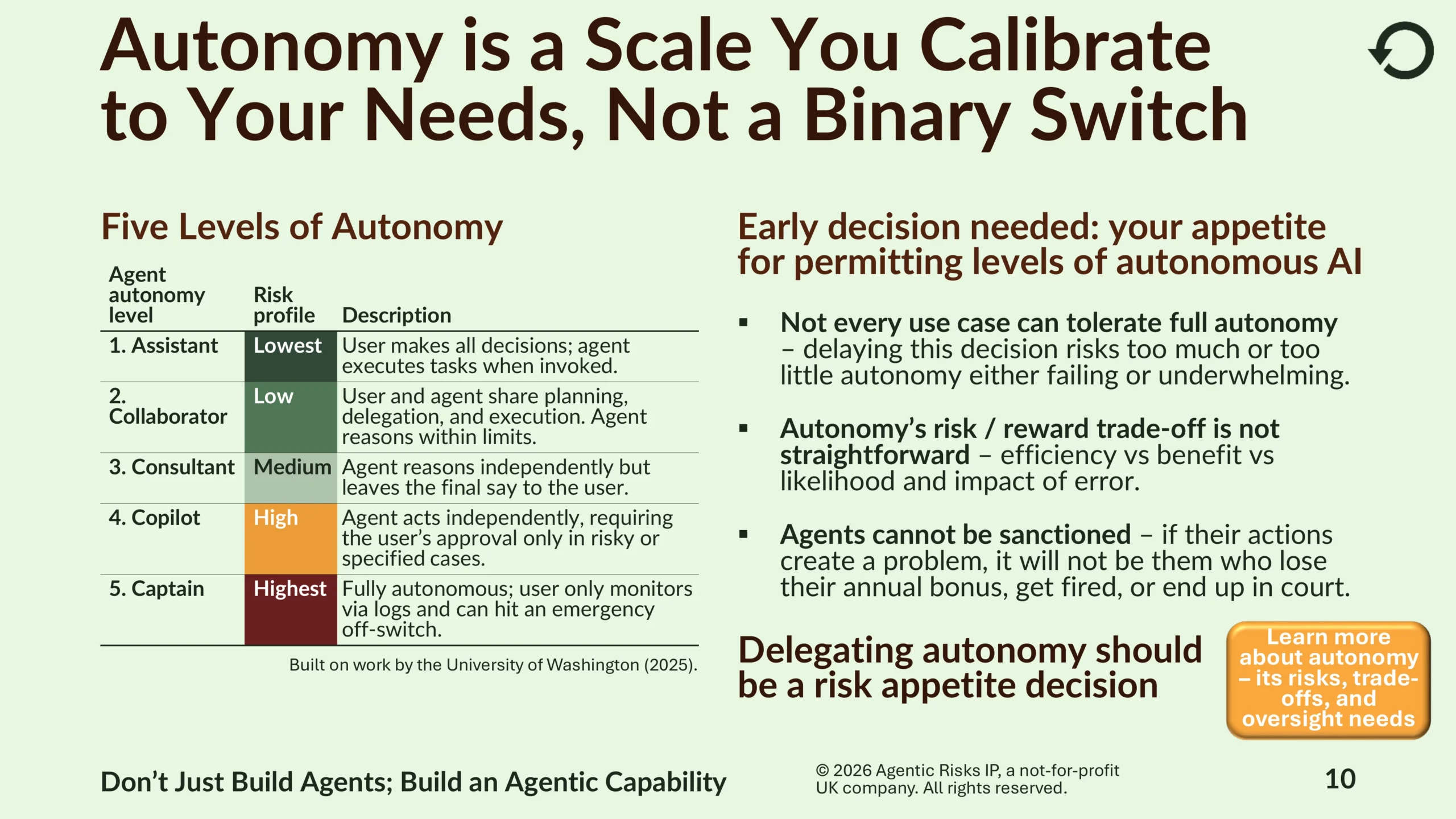 Autonomy is a scale you calibrate to your needs, not a binary switch. A practical model of autonomy has five levels, ranging from Assistant (lowest risk, with the user making all decisions) to Captain (highest risk, fully autonomous). Because not every use case can tolerate full autonomy, how much autonomy you will permit should be an early risk appetite decision.