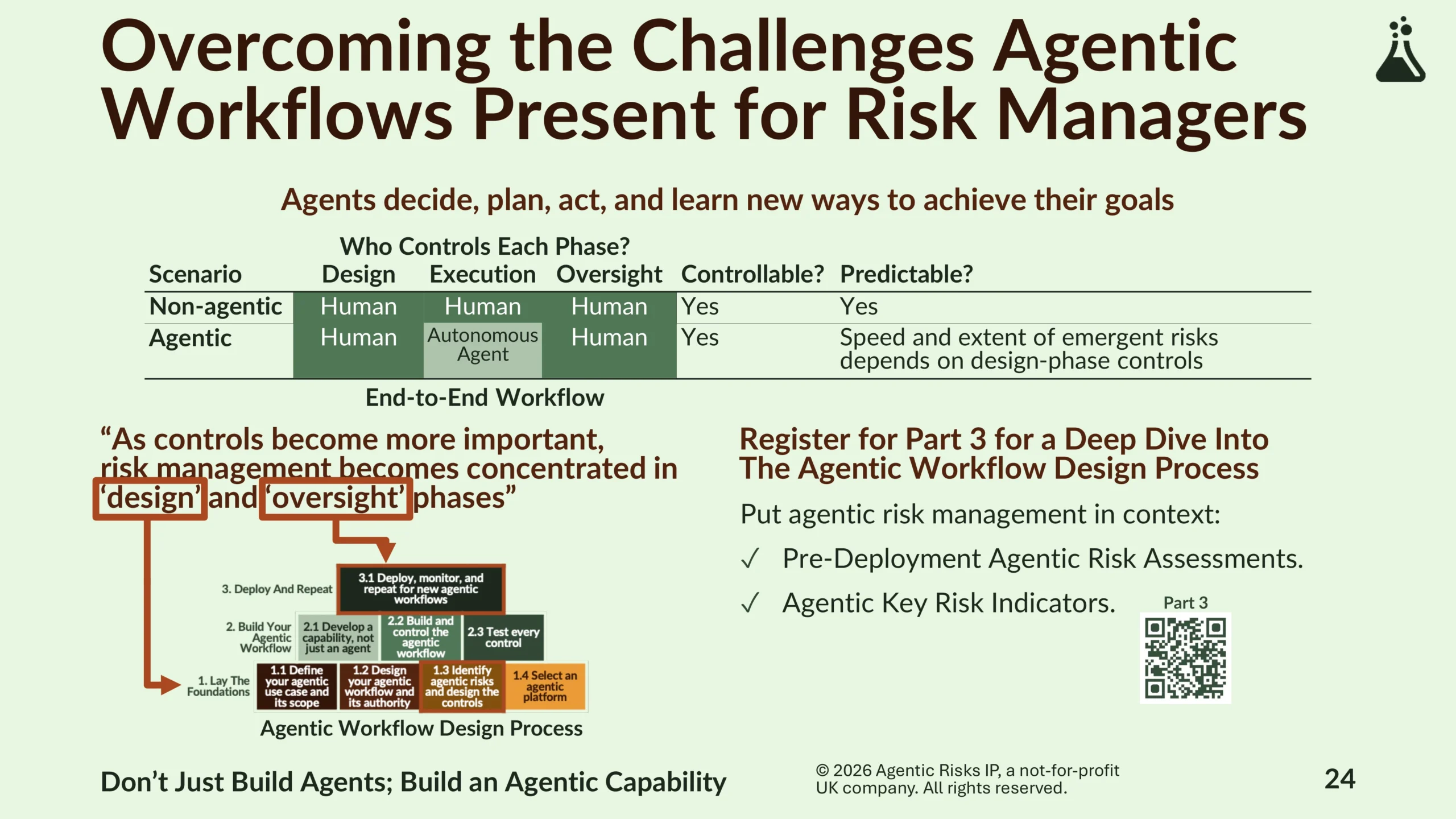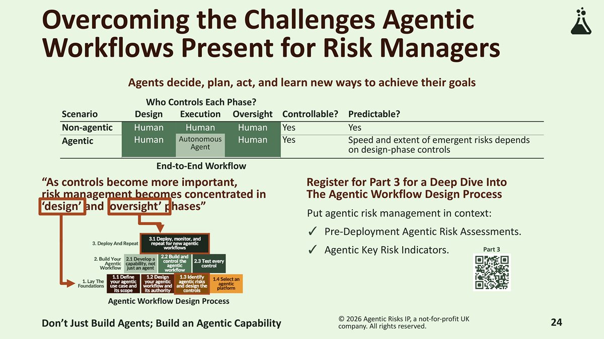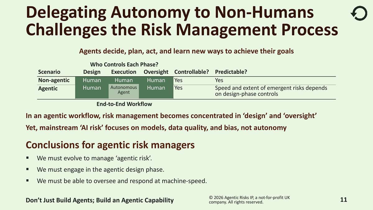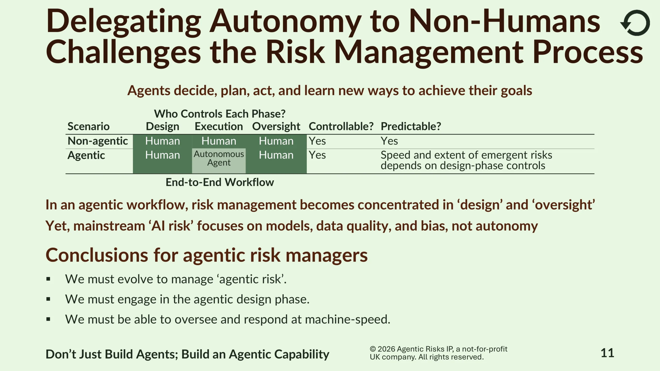 Delegating autonomy to non-humans challenges the risk management process – agents decide, plan, and act, which is the ‘execution’ phase of any workflow. Once you delegate this, risk management becomes concentrated in ‘design’ and ‘oversight’ phases. As a result, risk managers in organisations that have agentic processes will need to evolve by engaging in the agentic design phase and being able to oversee and respond at machine speed.