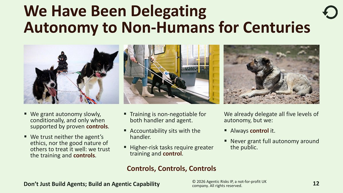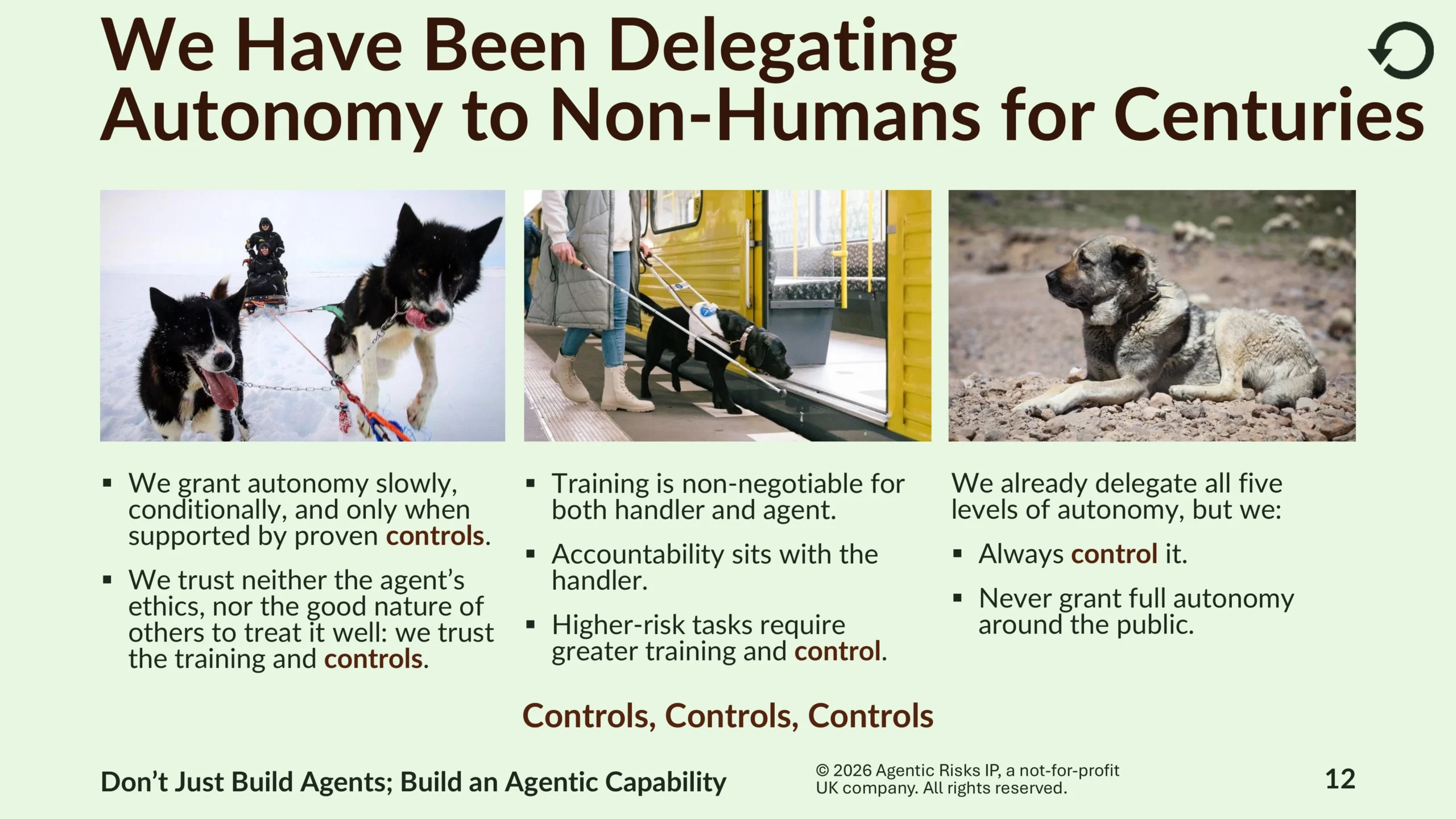 We have been delegating autonomy to non-humans for centuries – we already delegate all five levels of autonomy to different types of working dogs and, over time, have learned important lessons that apply to agentic risk appetite: