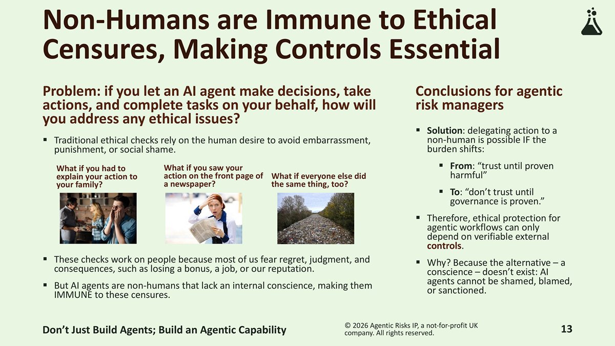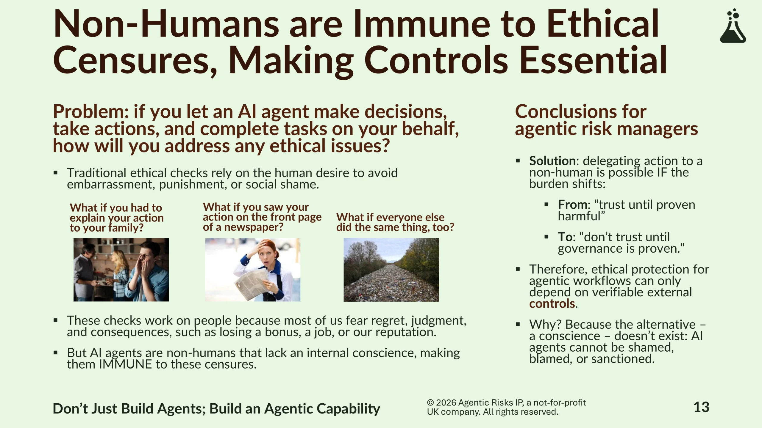 Ethical protection for agentic workflows can only depend on verifiable external controls. This is because AI agents cannot be shamed, blamed, or sanctioned, making them immune to ethical censures. As a result, when we delegate action to a non-human, we should shift from “trust until proven harmful” to “don’t trust until governance is proven.”
