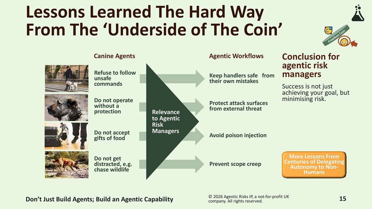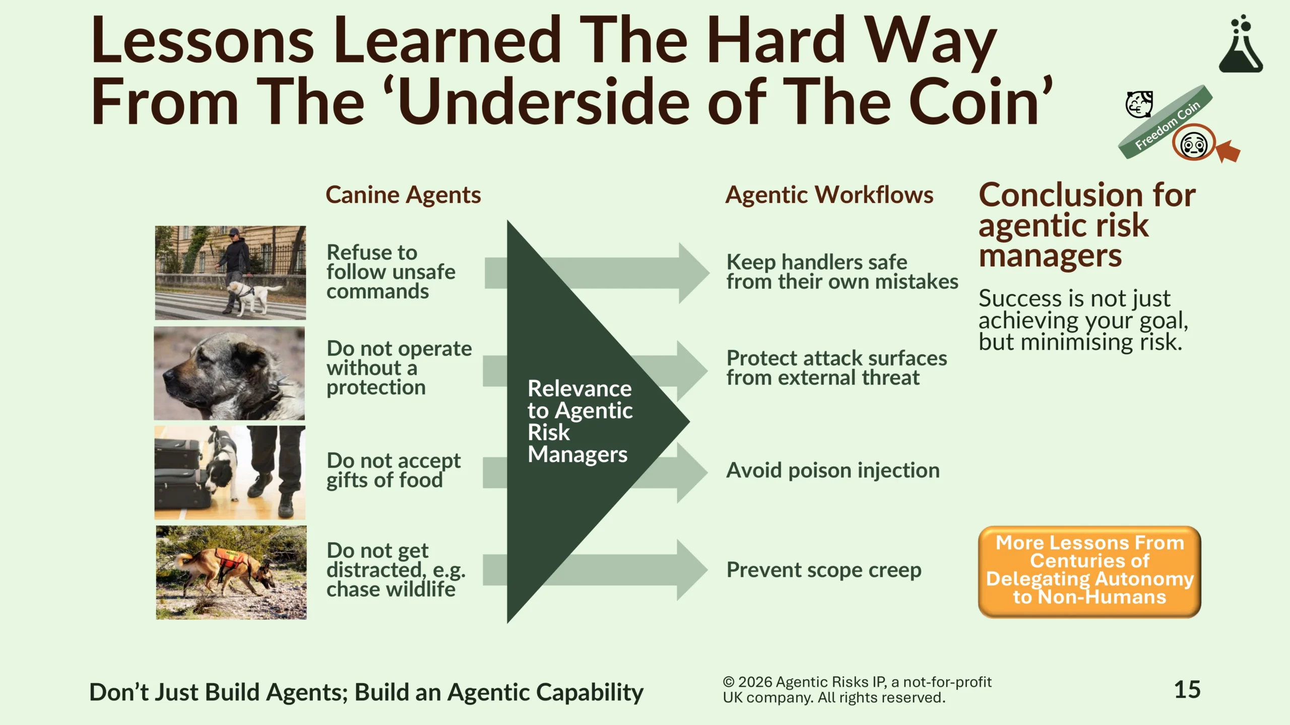 Success is not just about achieving your goal, but also about minimising risk. We applied lessons learned the hard way from the ‘underside of the coin’ to agentic risk appetite: keep the agent handler safe (potentially from their own mistakes), protect yourself from new attack surfaces that agents create, avoid poison injection, and prevent scope creep.