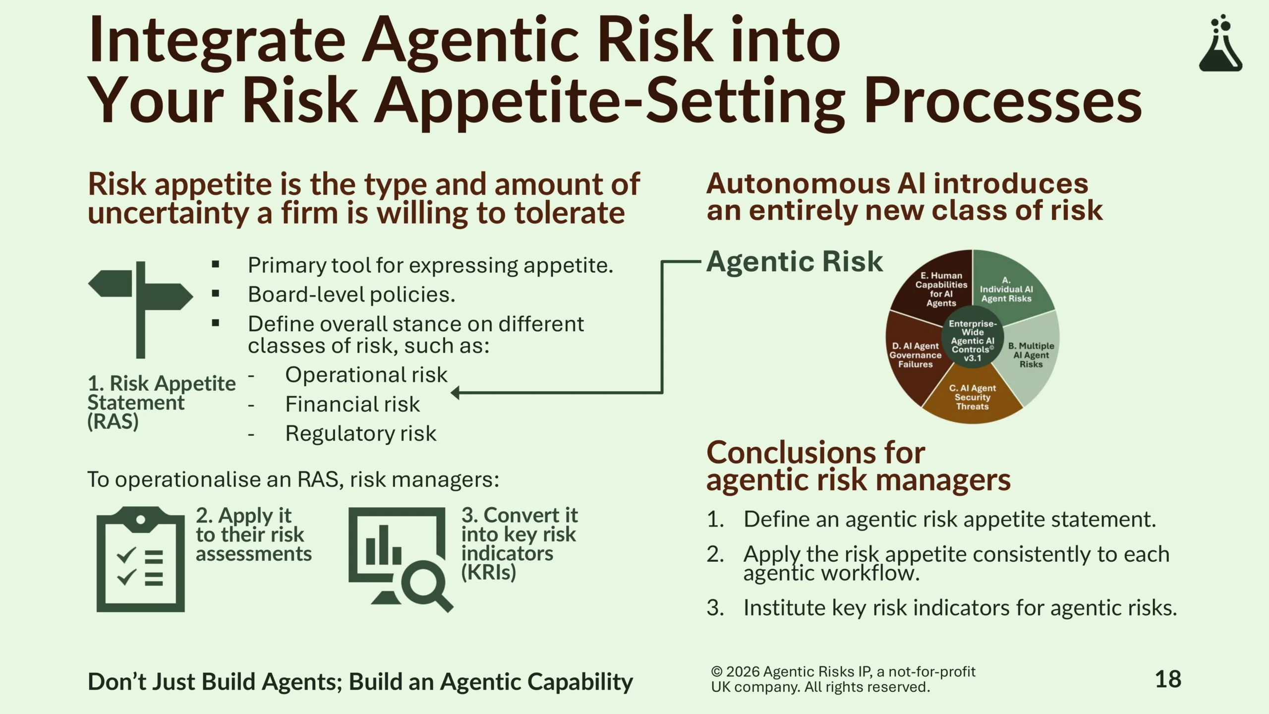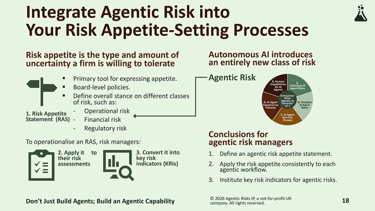 Drawing lessons from established risk management disciplines and centuries of delegating autonomy to non-humans, Agentic Risks sets out a practical approach – define a board-level risk appetite statement, embed it into workflow-level risk assessments, and institute agentic key risk indicators.