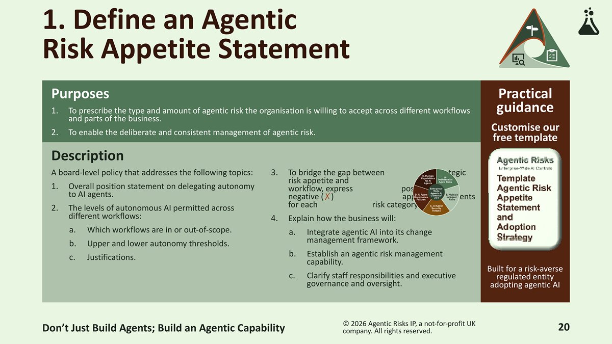 Engage the top of the house and give the organisation clear direction with a board-level statement that explains how you apply risk appetite to AI agents. Our downloadable template recommends the following content: