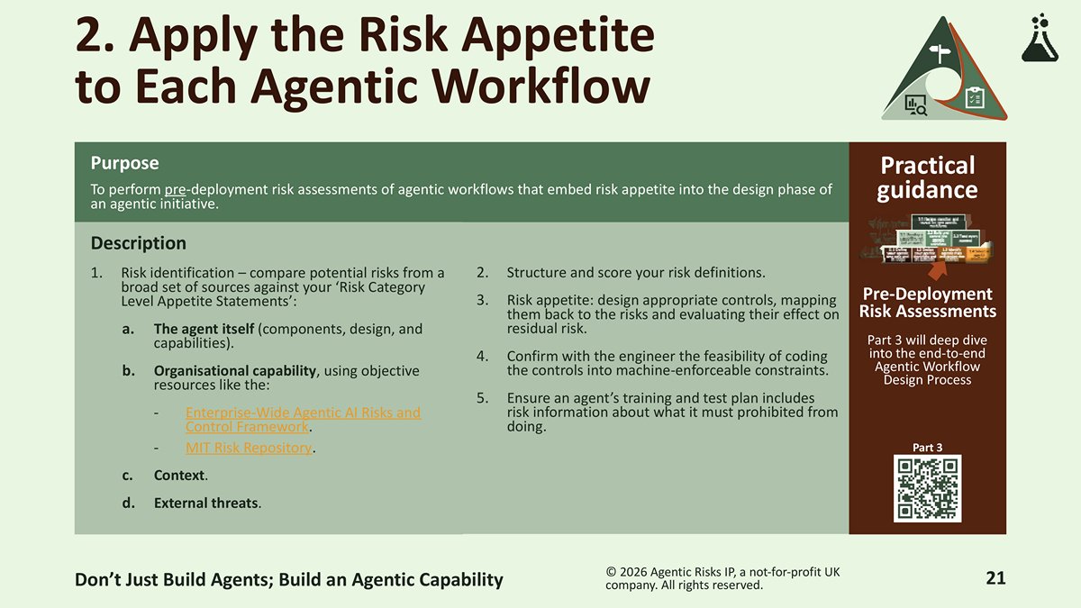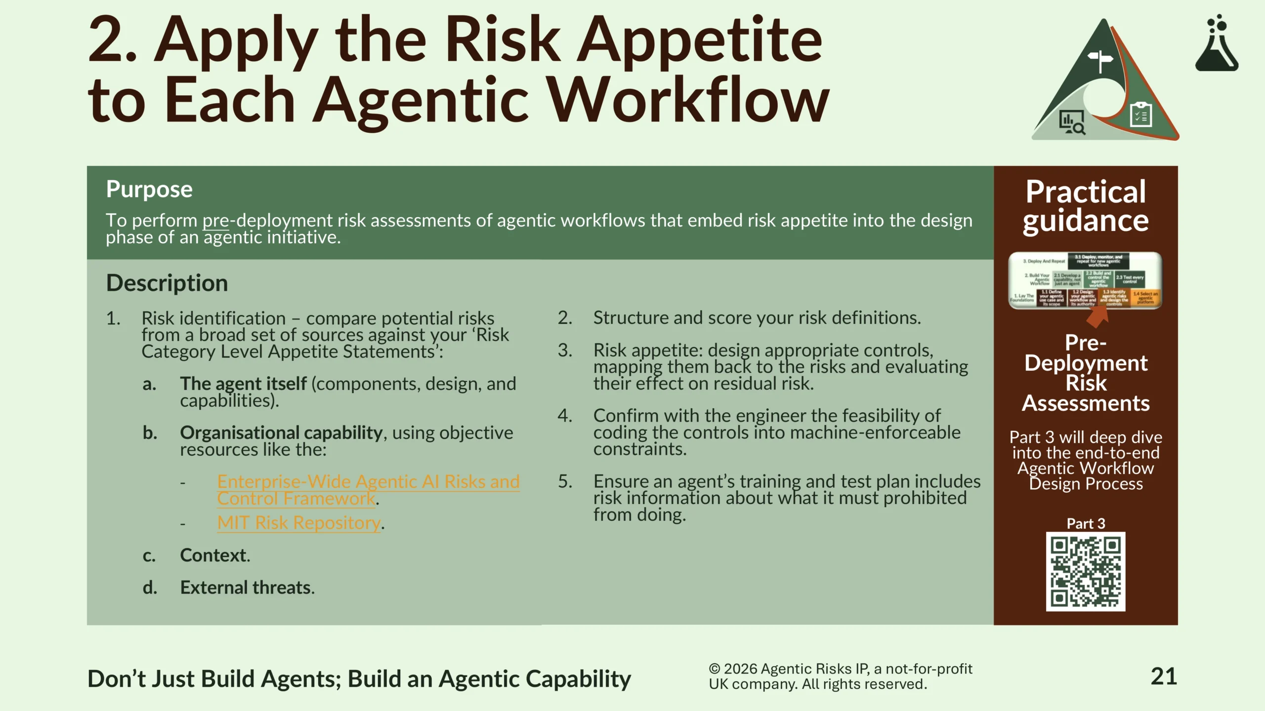 - Apply the risk appetite consistently to each agentic workflow through agentic workflow risk assessments.