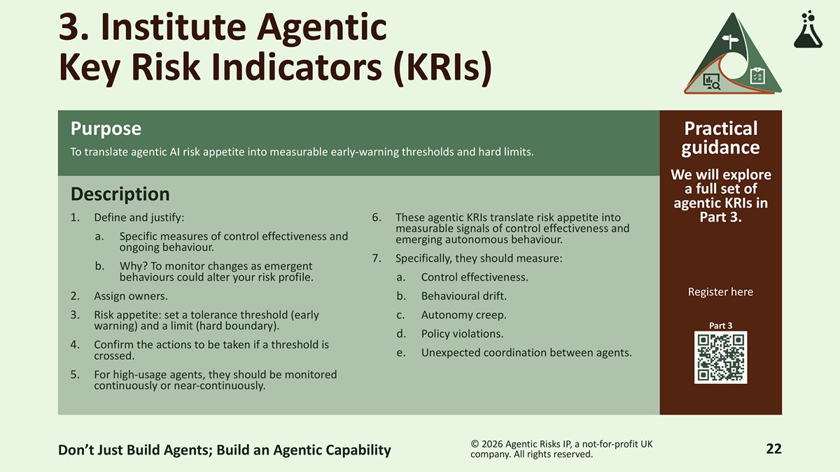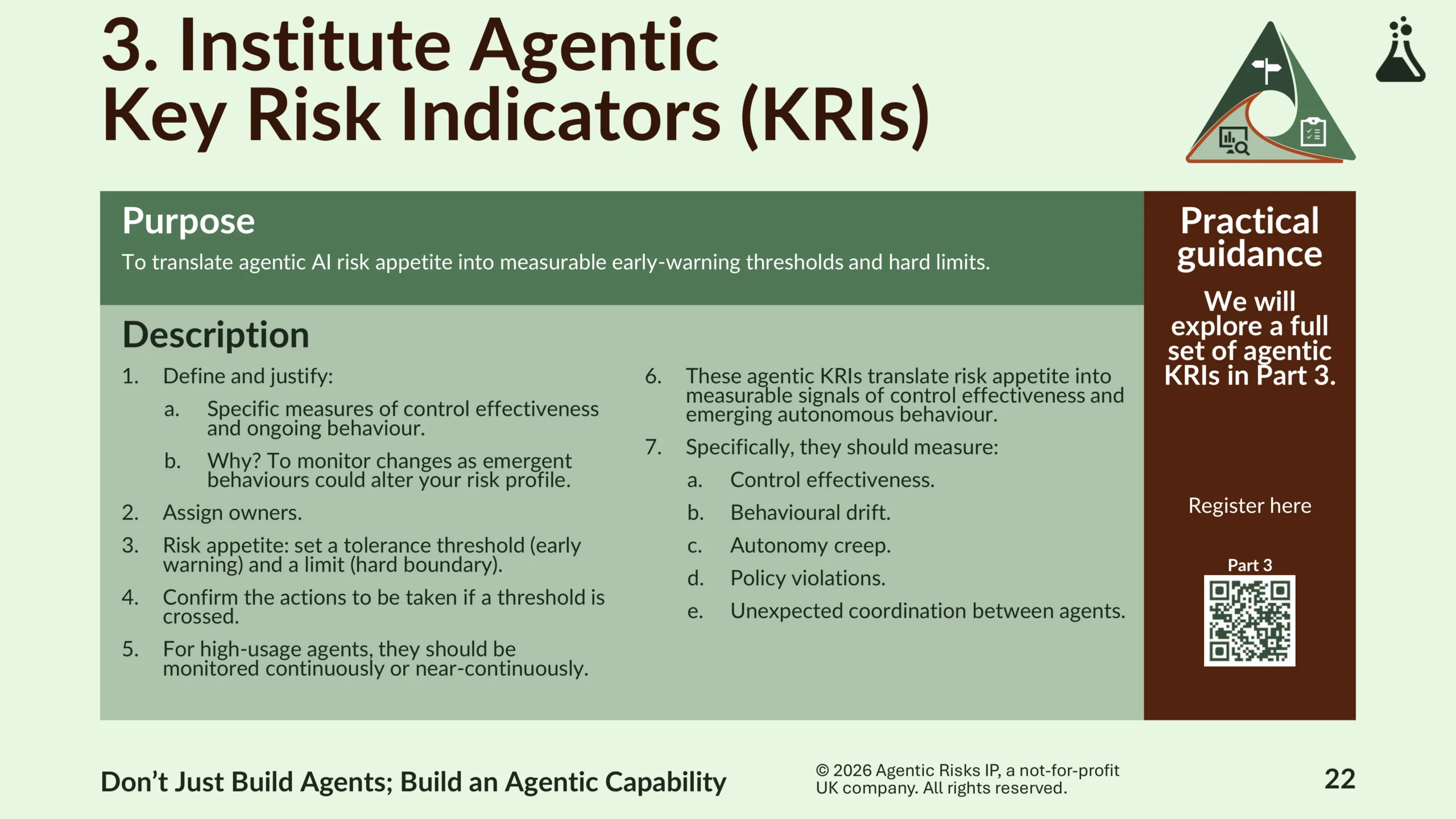 - Part 3 of the webinar series will include a full set of agentic KRIs. Register now.