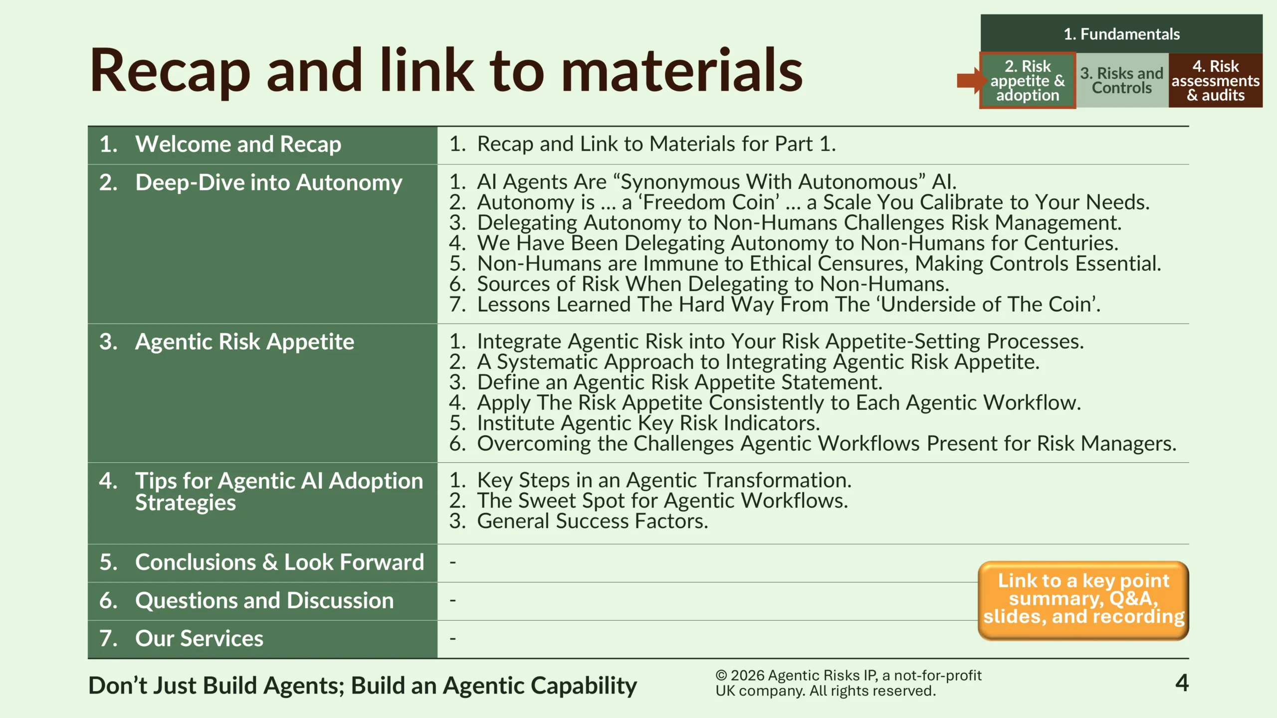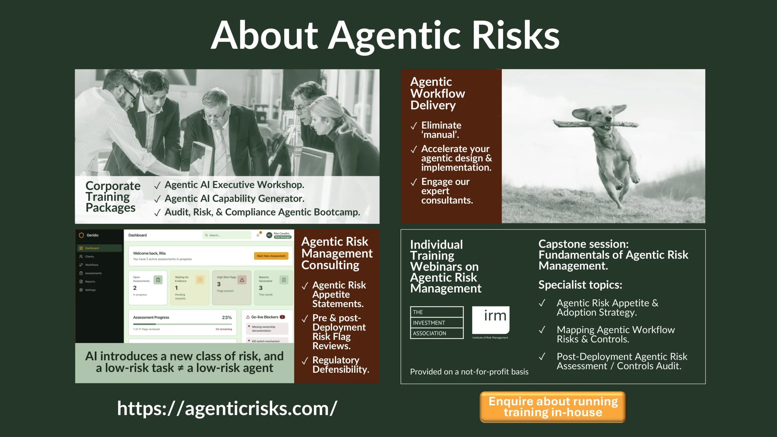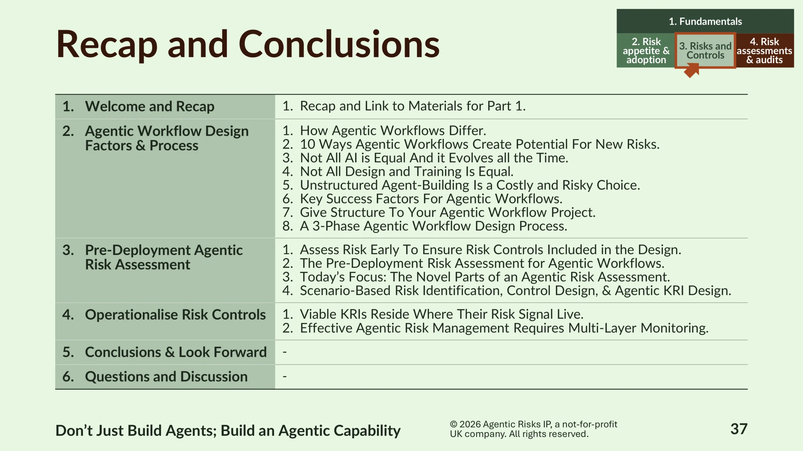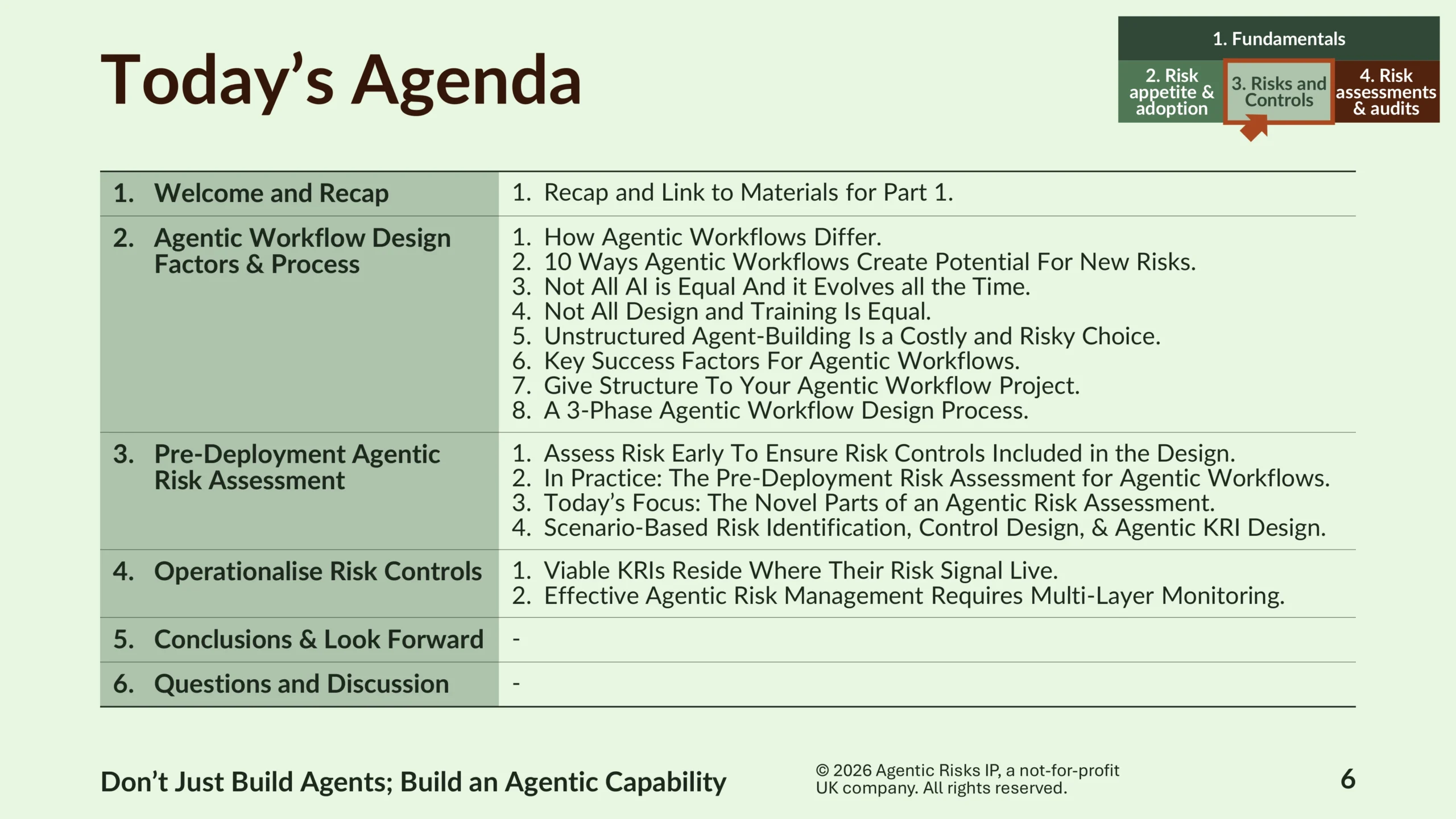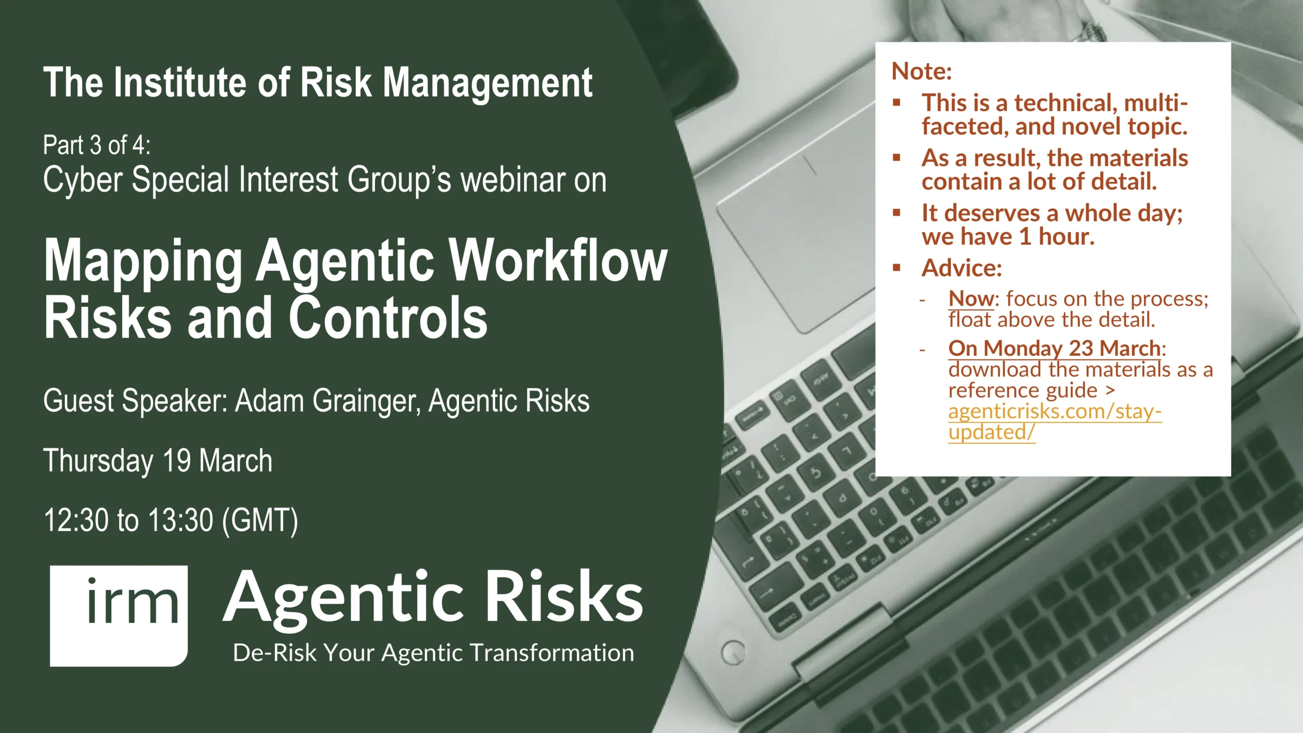 Here is a summary of my presentation on how to assess agentic workflow risks and controls in practice (including attendees’ Q&A at the end), the full video, and a download link to the slides, which include all the concepts and links to deep-dive content.