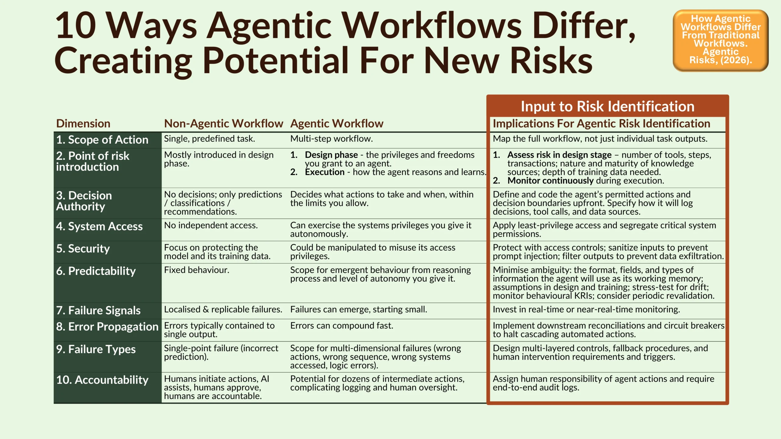 Risk management should be systematic, though, so we developed this comparison with a model of 10 dimensions where agentic workflows differ and, therefore, where potential exists for new uncertainties that risk managers should identify. These dimensions include scope of action, decision authority, system access, predictability, error propagation, and accountability.