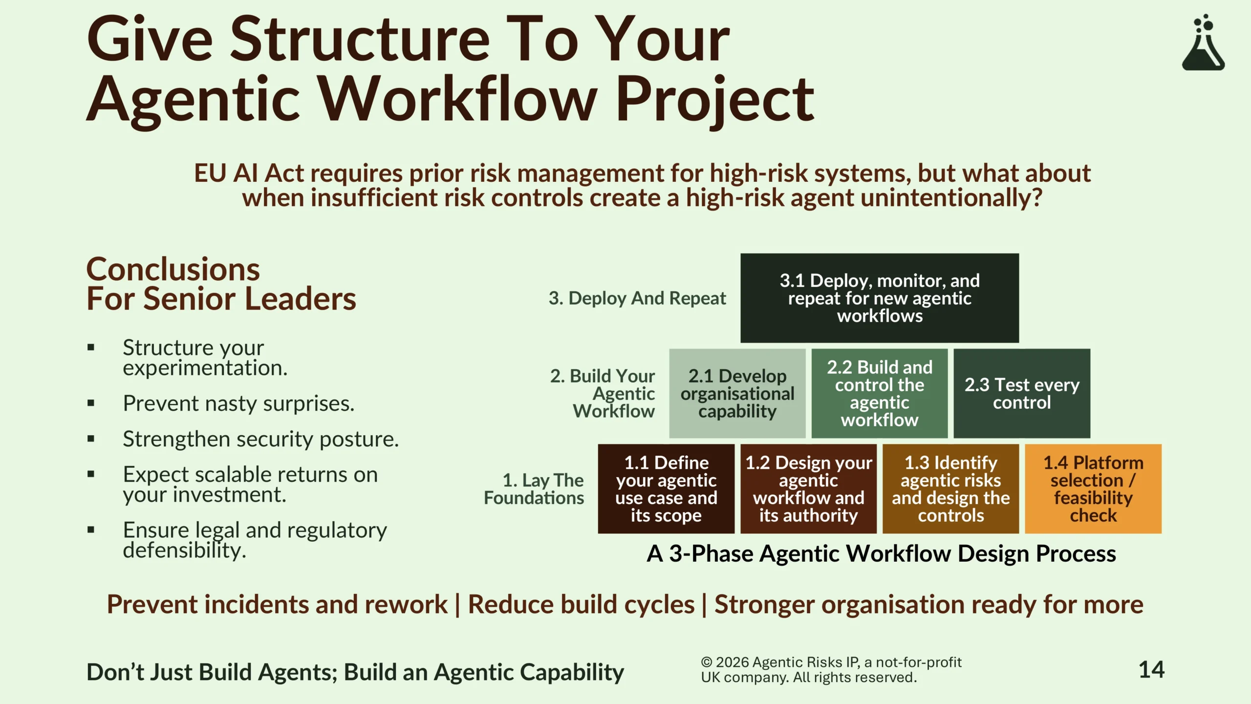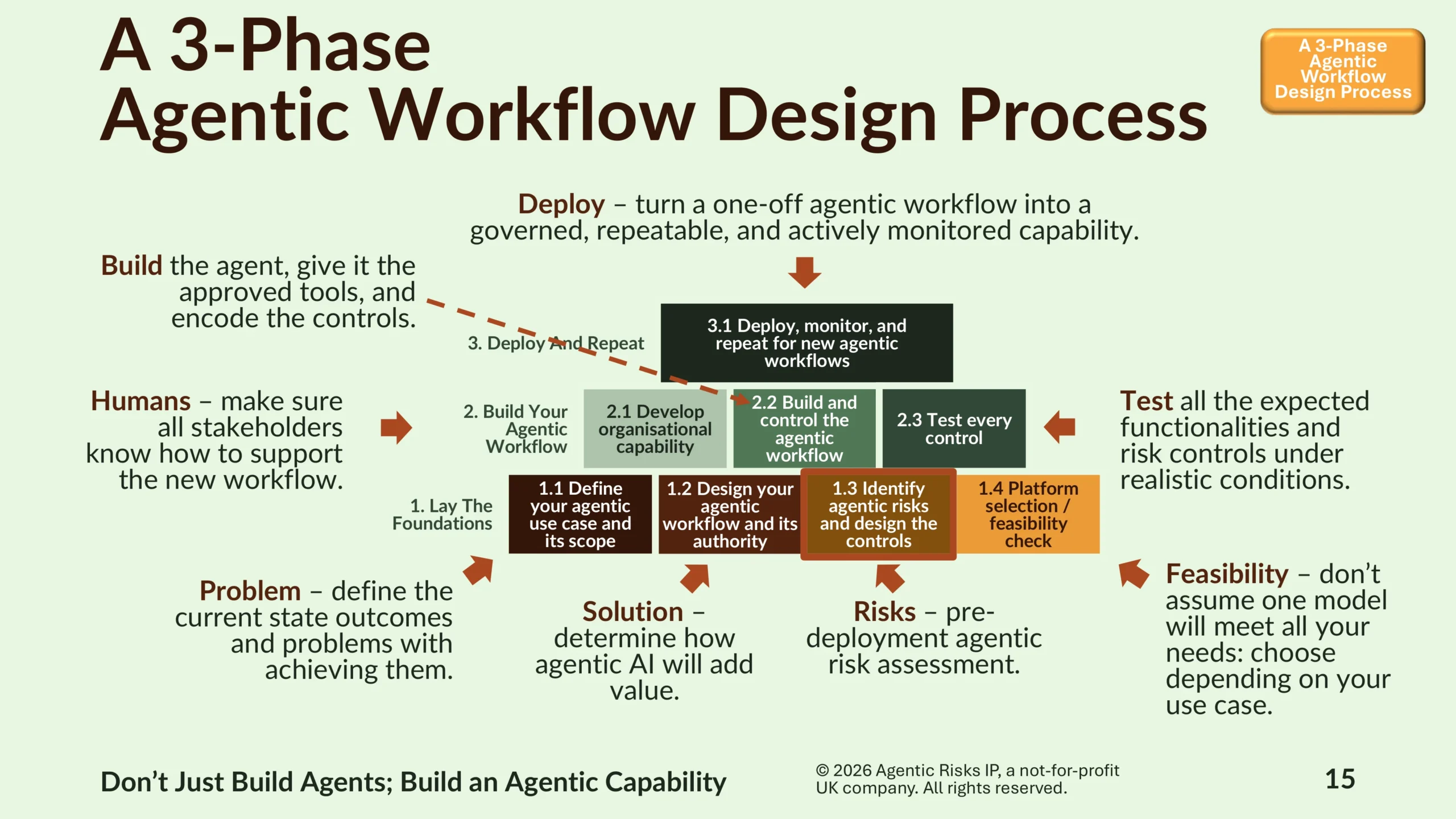 We explored a 3-Phase Agentic Workflow Design Process showing how to schedule a structured agentic workflow risk assessment so that it prevents incidents and rework, reduces build cycles, and produces a stronger organisation ready for more.