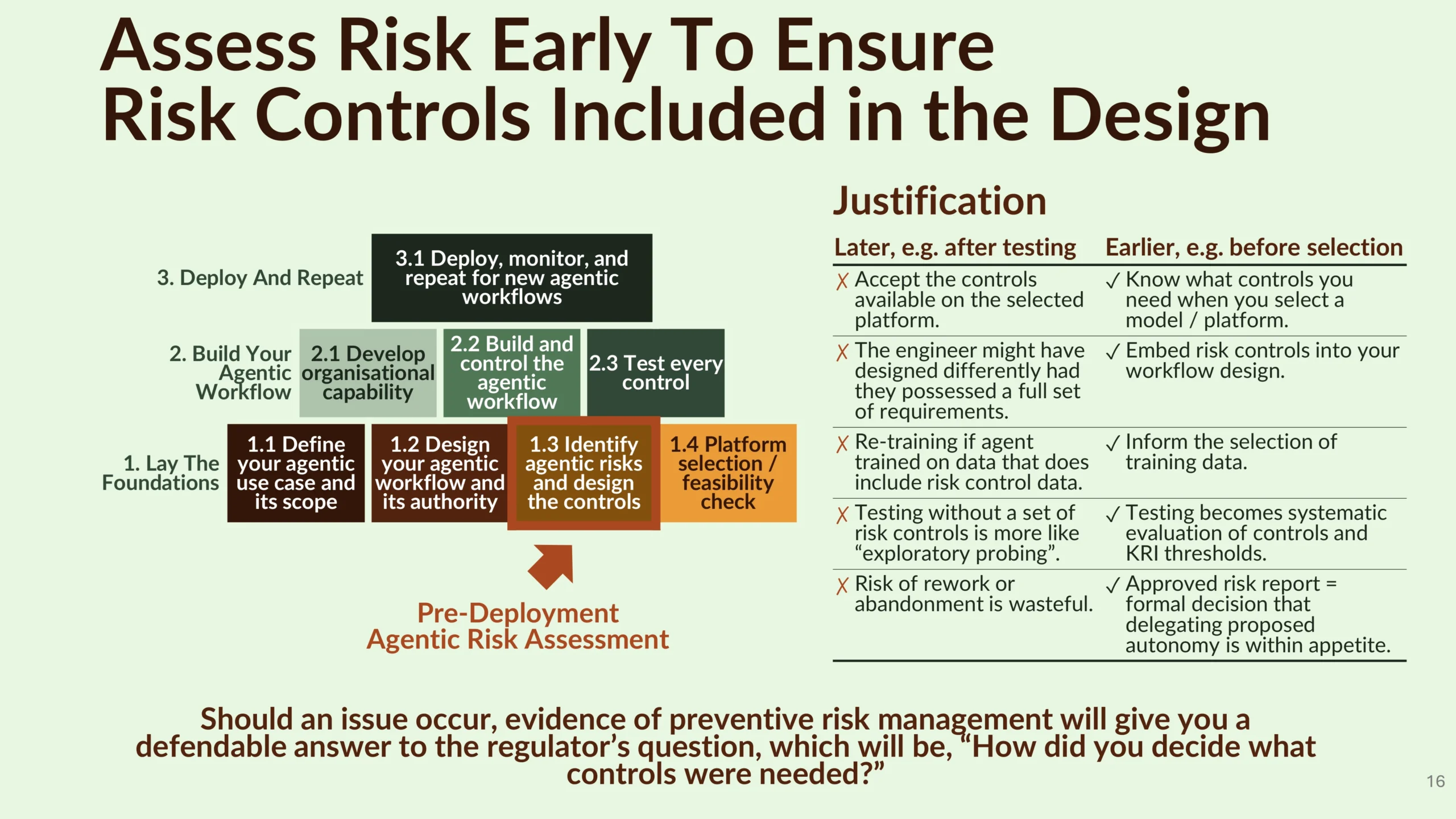 In particular, assessing risk early ensures controls are embedded in the design, informs training data selection, makes testing systematic rather than exploratory, and produces a formal decision that delegating the proposed autonomy is within appetite.