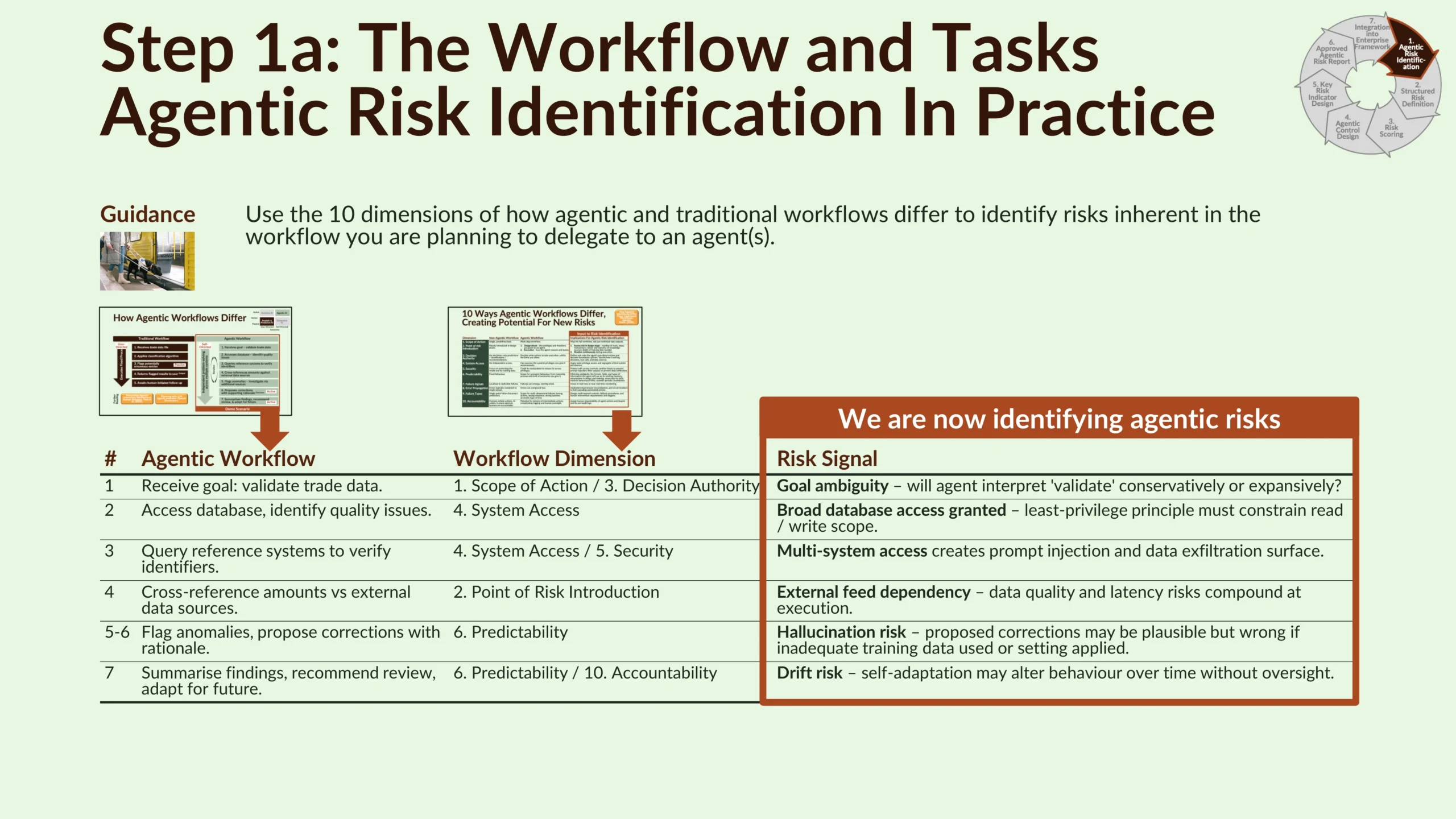 The Workflow and Tasks – use the 10 dimensions of how agentic workflows differ to map the workflow to inherent risk signals.