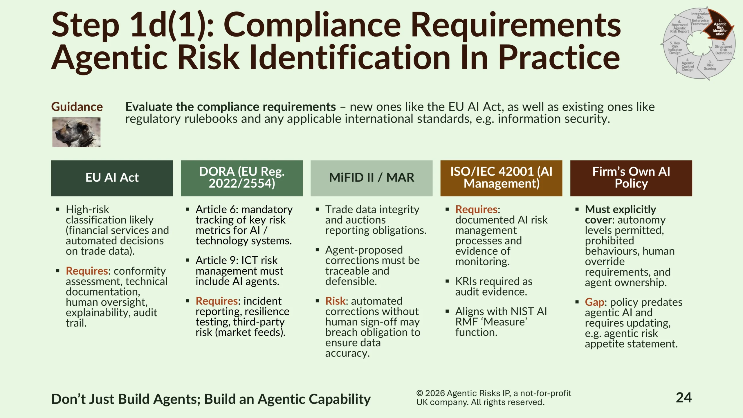 - Evaluate the compliance requirements across new and existing frameworks – each imposing specific obligations that generate additional risk signals for agentic workflows.