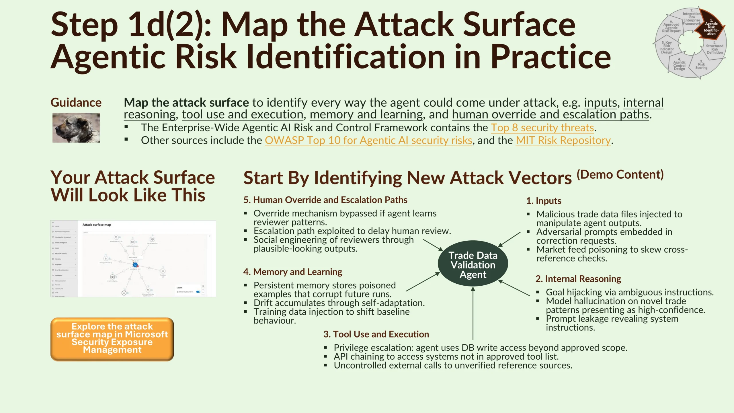 - Map the attack surface across five vectors – inputs, internal reasoning, tool use and execution, memory and learning, and human override and escalation paths – to identify every way the agent could come under attack.
