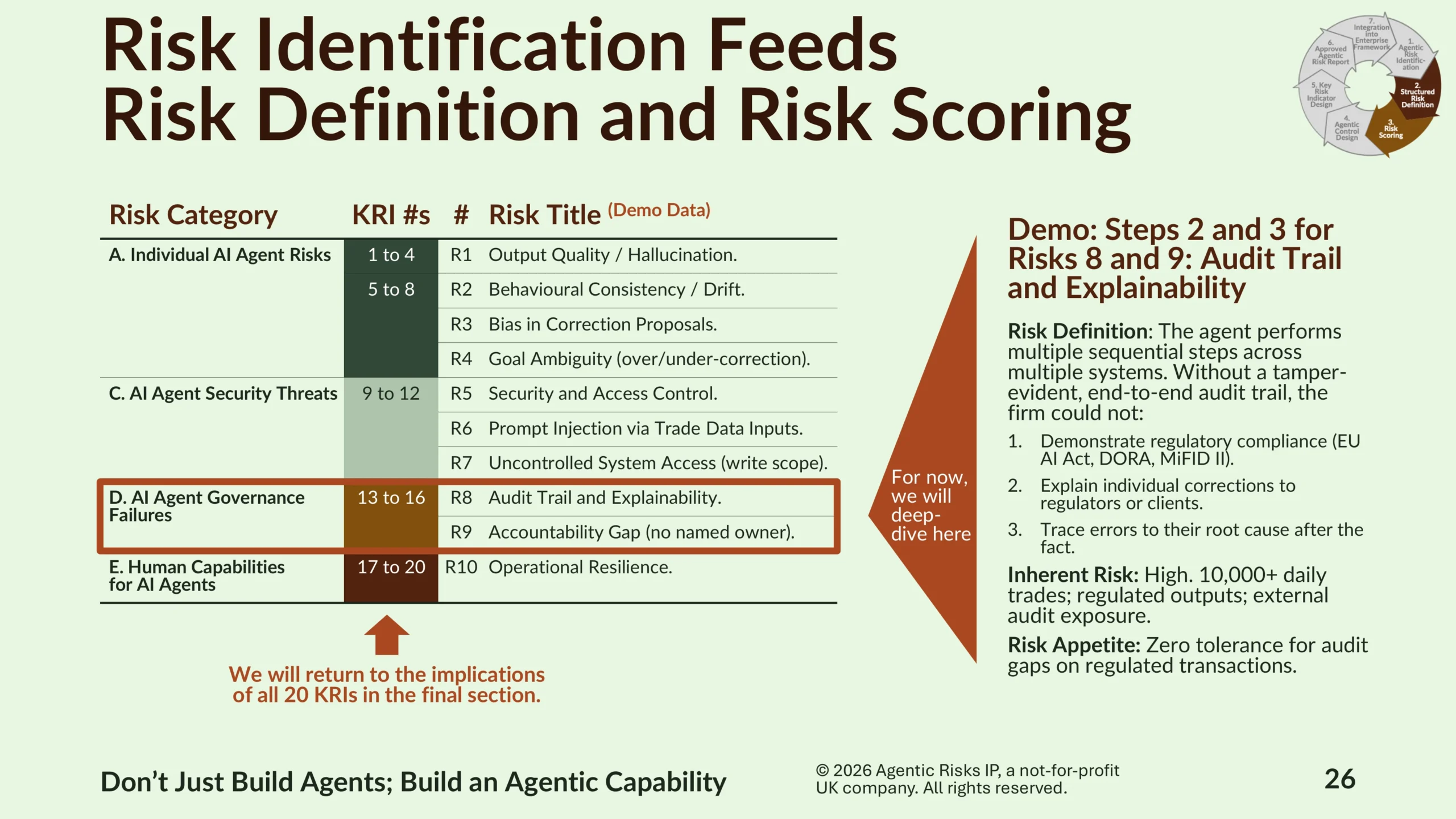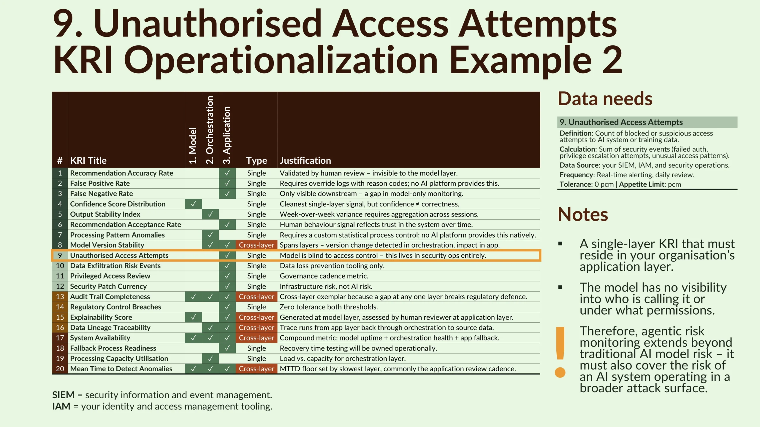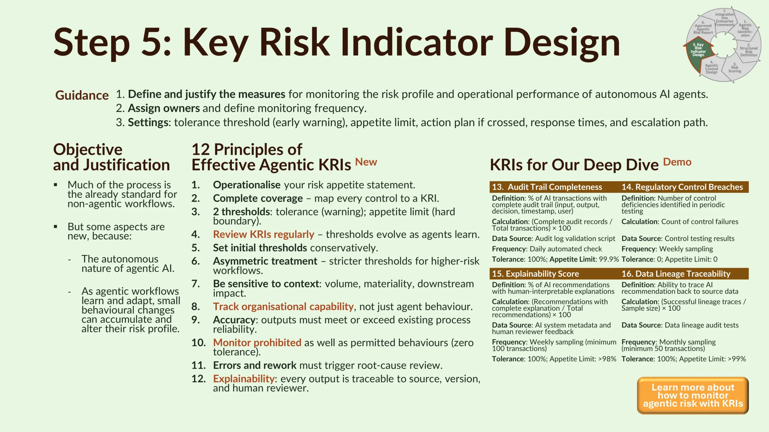 KRI design for agentic workflows is materially novel because of the autonomous nature of agentic AI, the potential for small behavioural changes to alter a risk profile, and the structure of an agentic workflow influencing how you operationalise your KRIs.