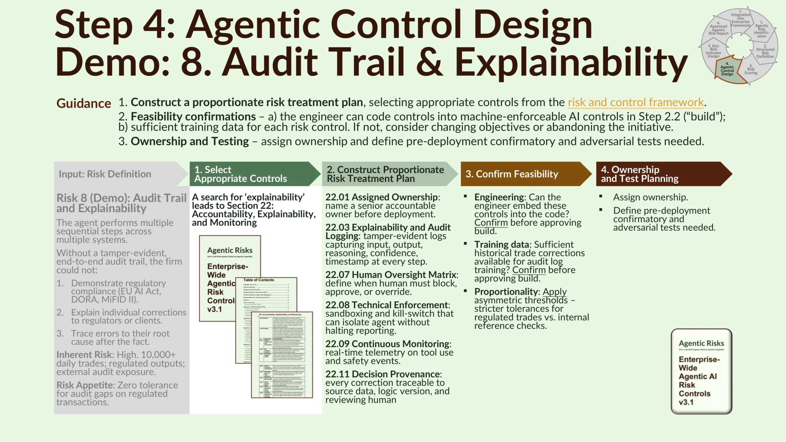 To be confident you can construct a proportionate and best practice risk treatment plan and design agentic AI controls and KRIs, find your risk in the Enterprise-Wide Agentic AI Risk Control Framework and select the controls that are appropriate to your situation.