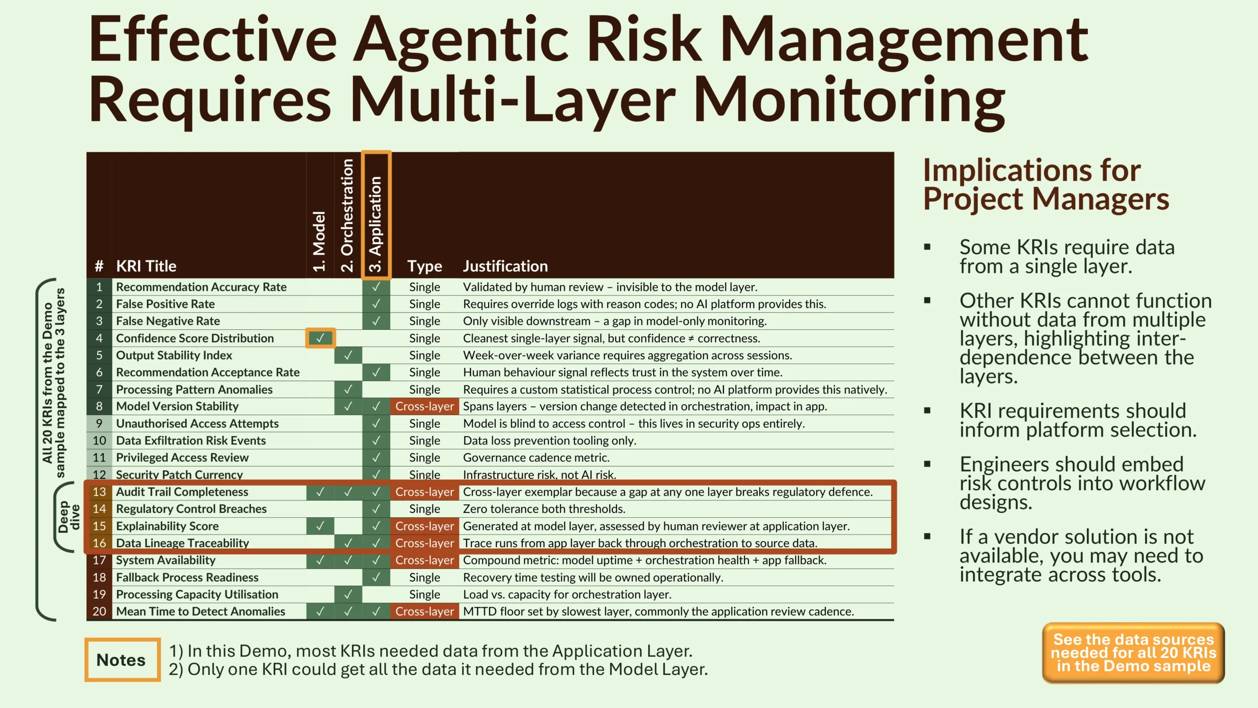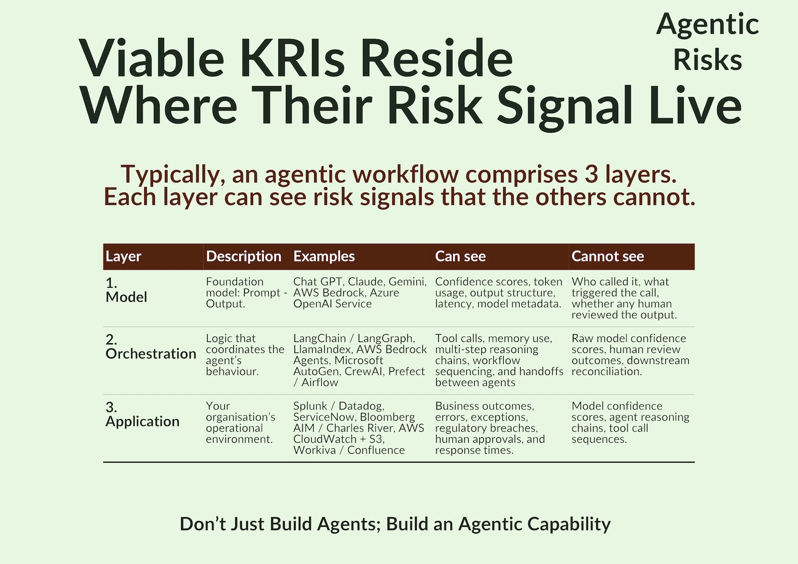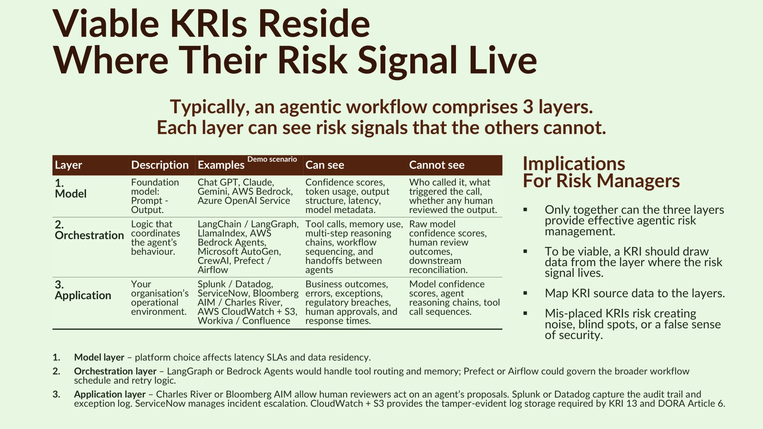 To operationalise your KRIs, you will need to account for the three-layer structure of an agentic workflow – model, orchestration, and application – in which each layer can see risk signals that the others cannot.