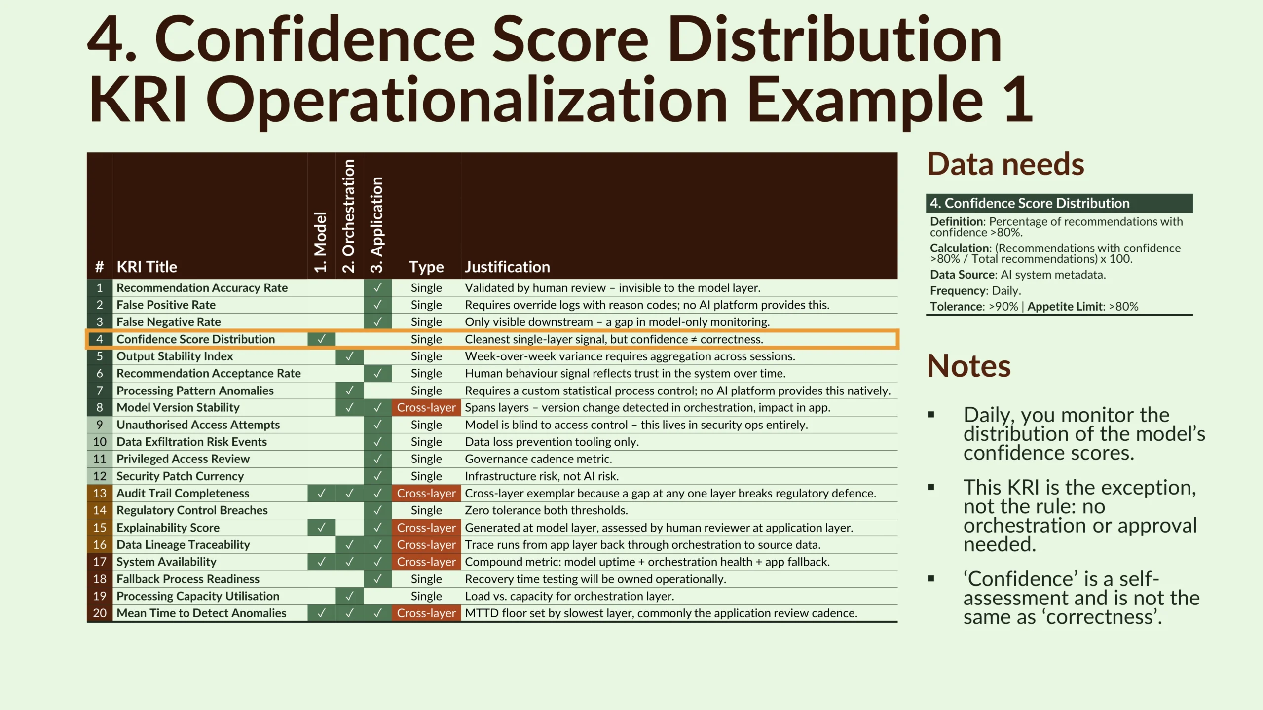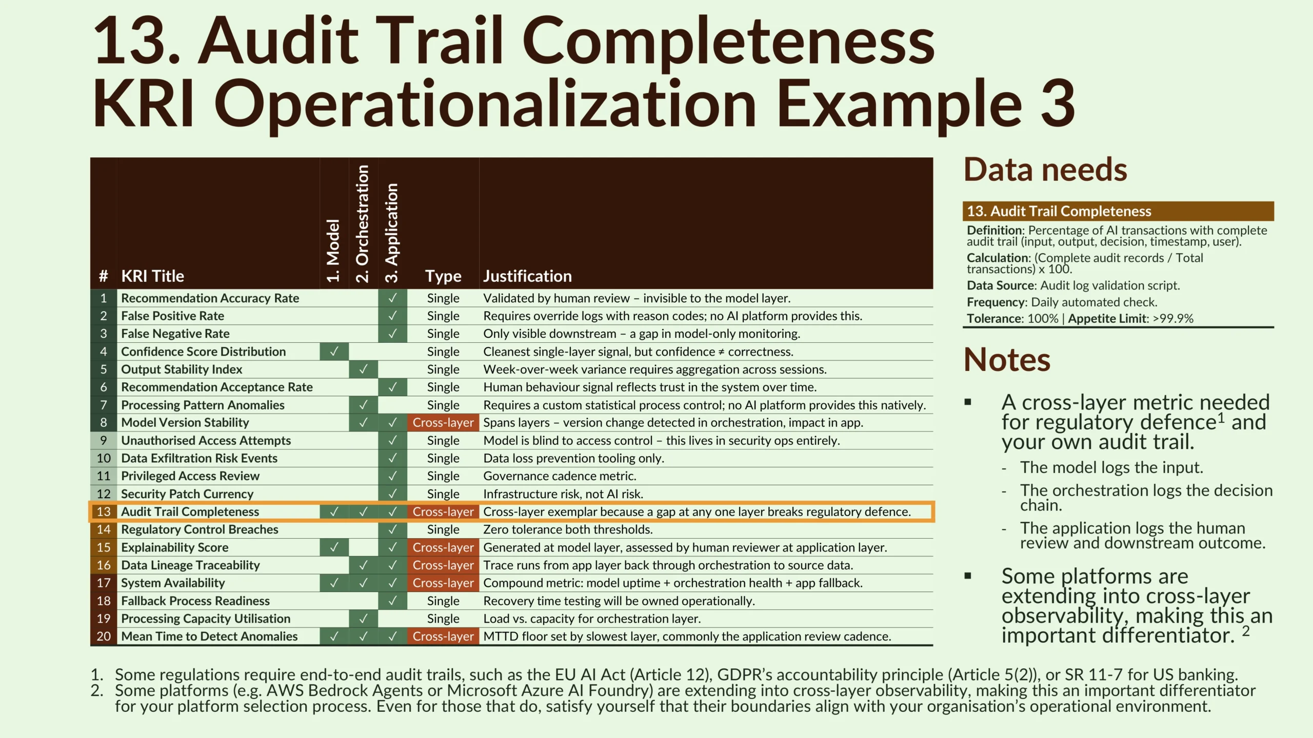 Lastly, some KRIs draw from a single layer, while others – such as Audit Trail Completeness and Mean Time to Detect Anomalies – are cross-layer and cannot function without data from multiple layers.