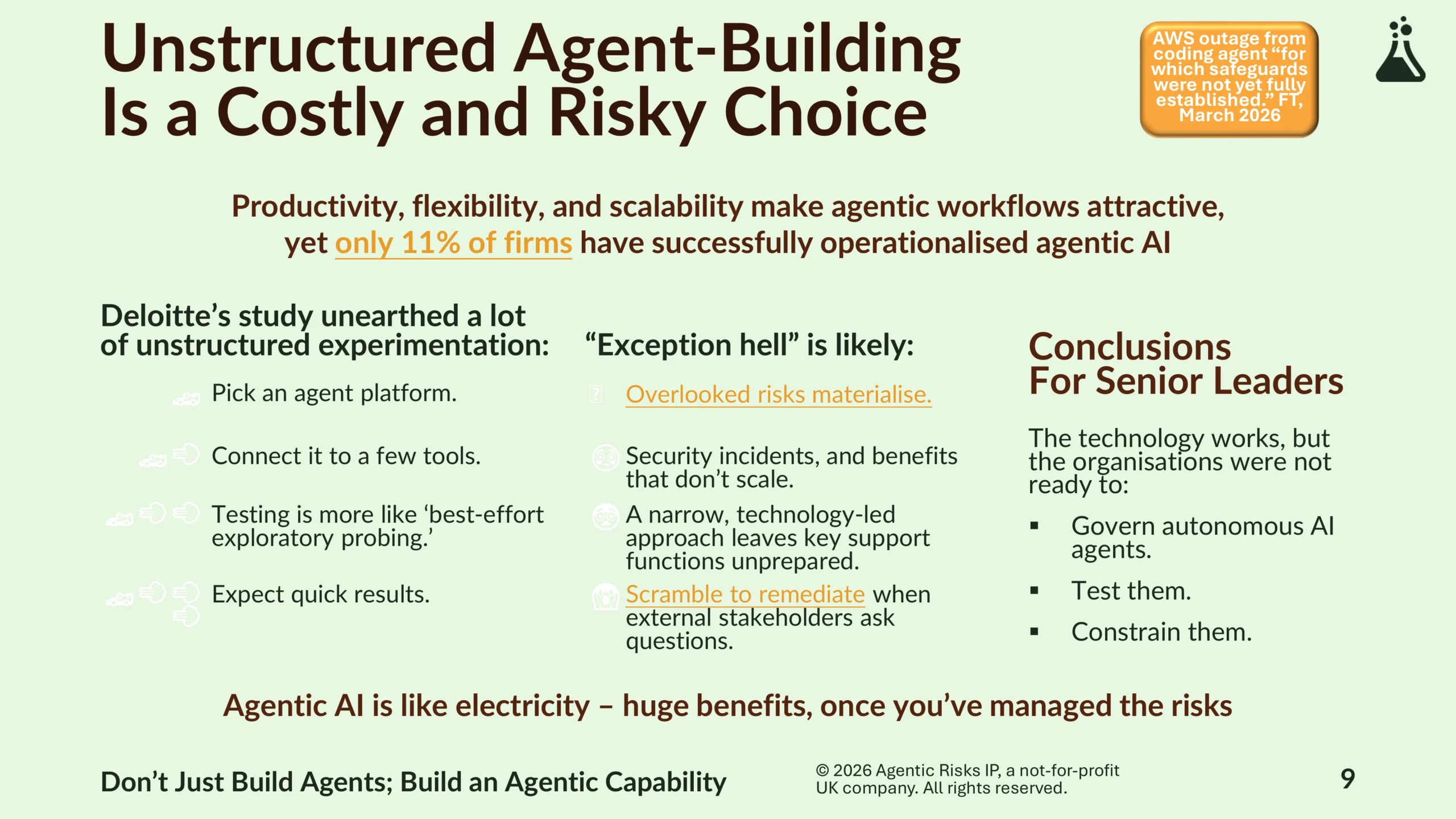 Unstructured agent-building is a costly and risky choice, increasing the chance of overlooked risks, security incidents, and scrambled remediation when external stakeholders ask questions.