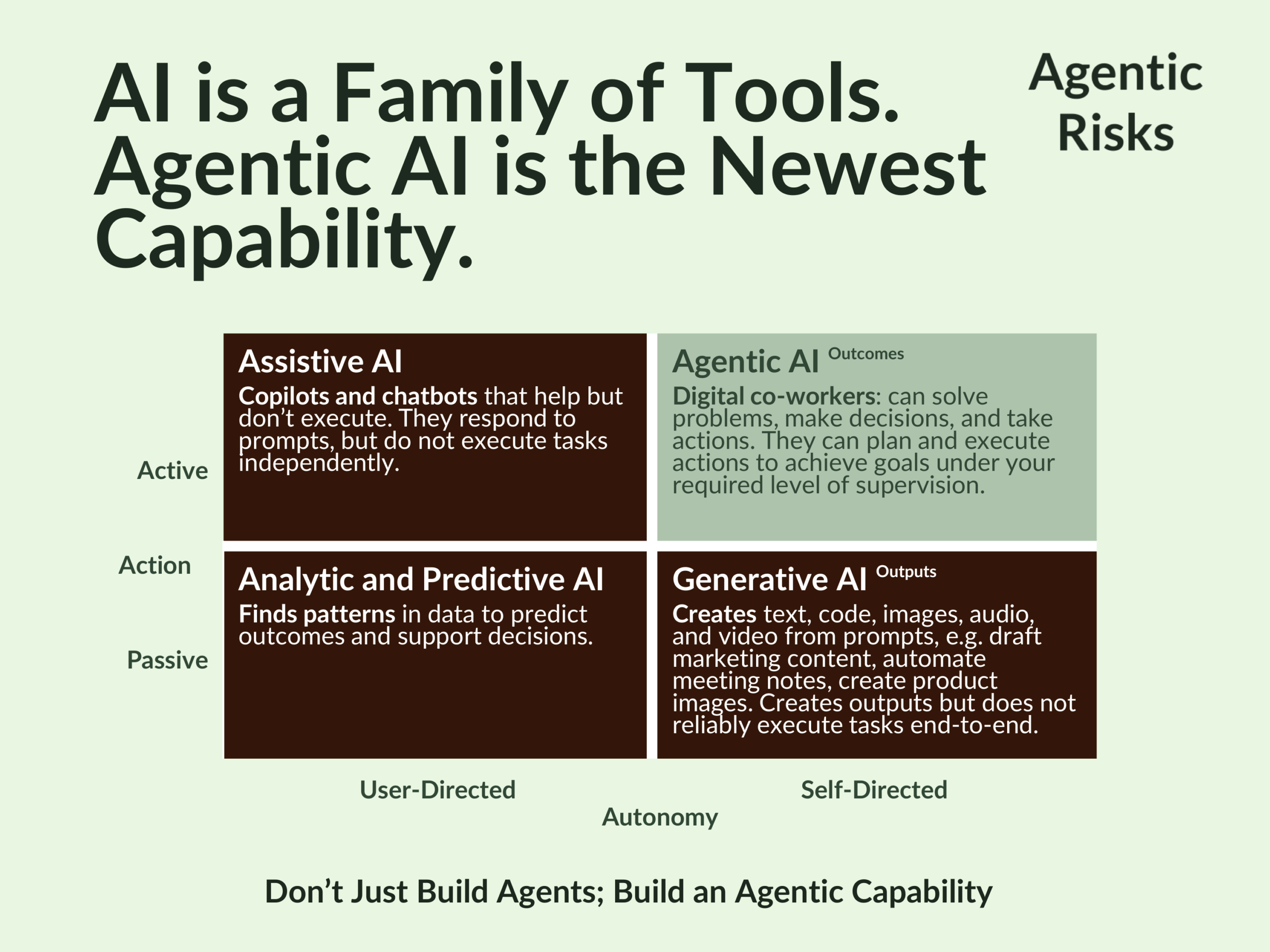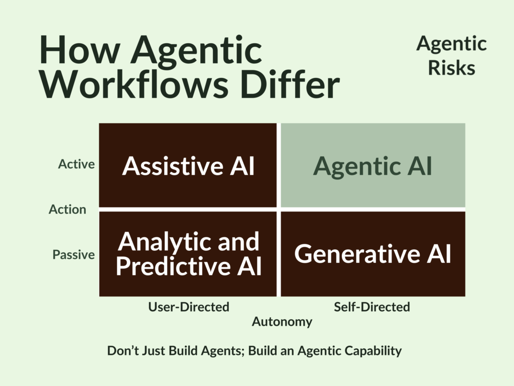 It actively pursues the objective you have given it, but does so under its own direction, placing it in the top-right quadrant of our matrix. As a result, in contrast to the static predictability of a non-agentic workflow, an agentic risk profile will change over time as new (learned) behaviours emerge.