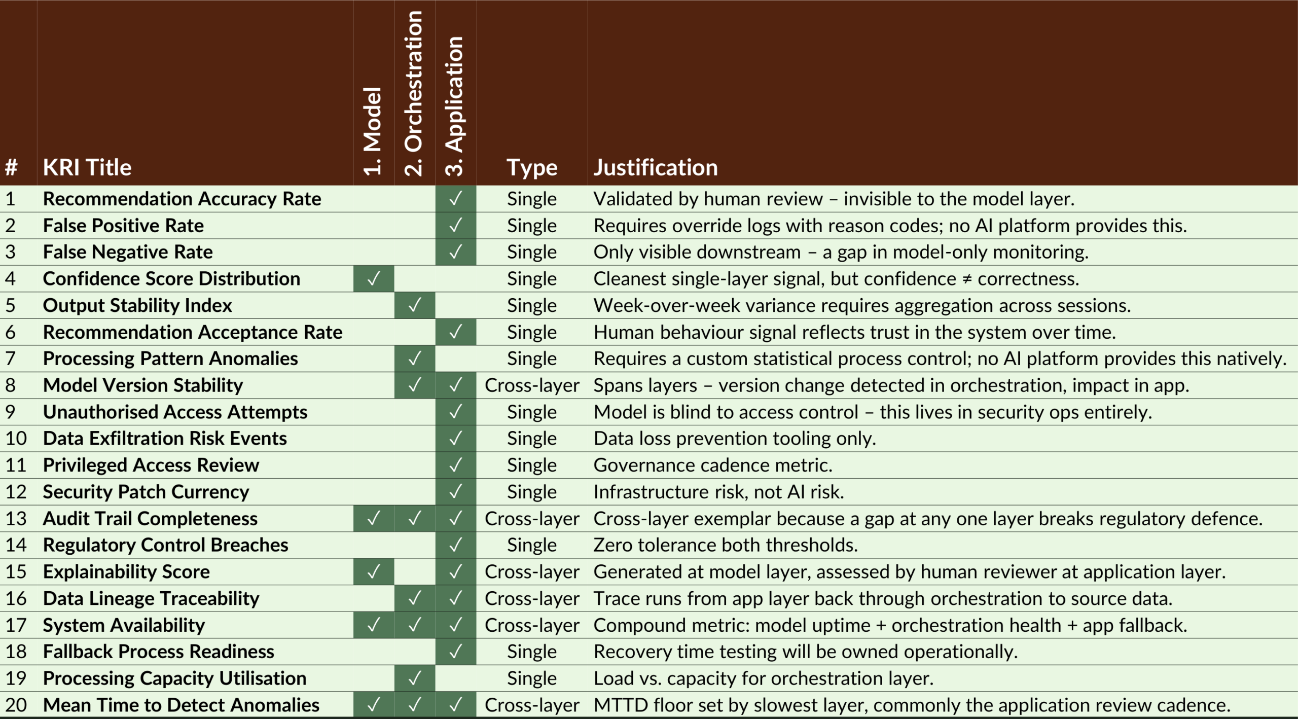 Agentic KRIs should be monitored in the layer where their risk signal naturally appears – whether the model, orchestration layer, or application environment. Placing a metric in the wrong layer can create blind spots, noise, or a false sense of security.
