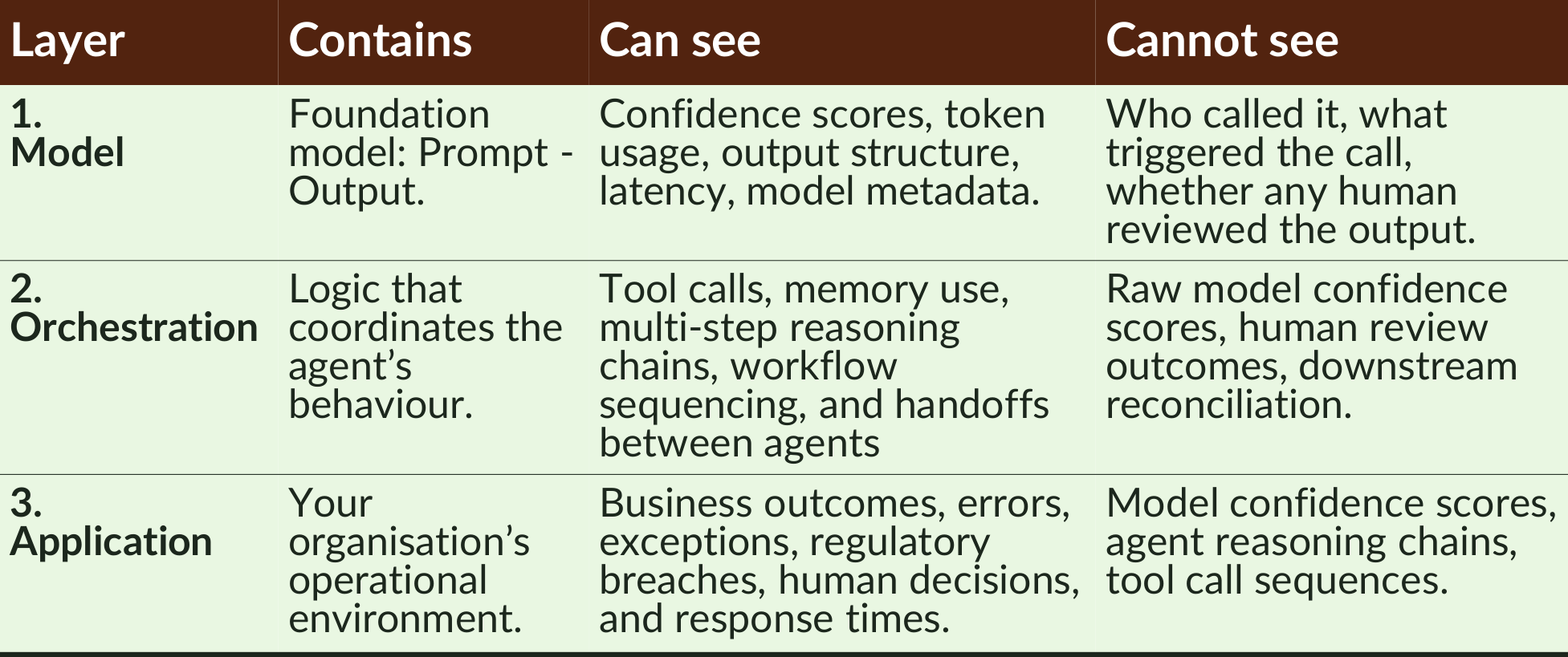 - Absence of cross-layer monitoring will impair regulatory defence, particularly under frameworks requiring end-to-end audit trails, such as the EU AI Act or sector-specific regulations (e.g. SR 11-7 for US banking).